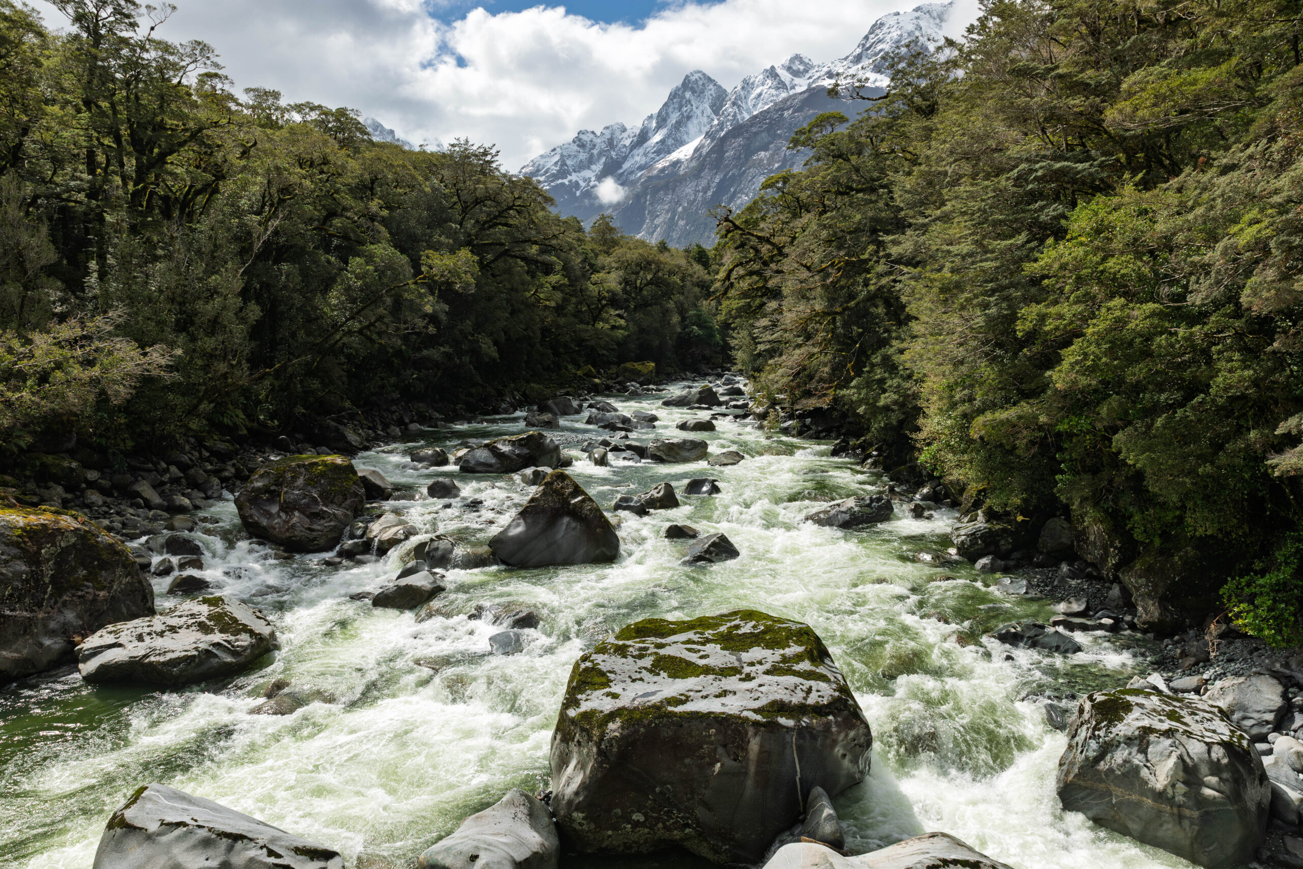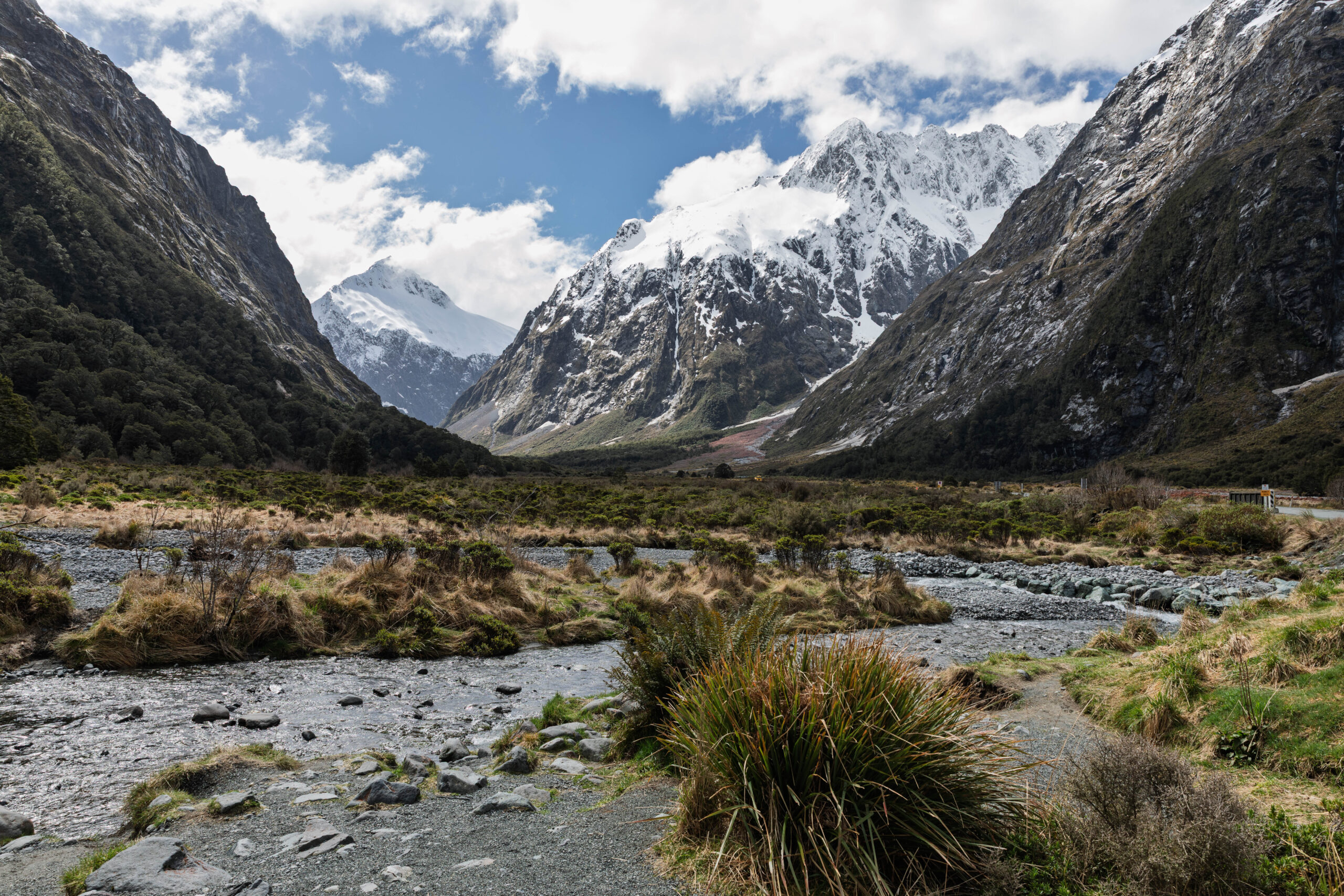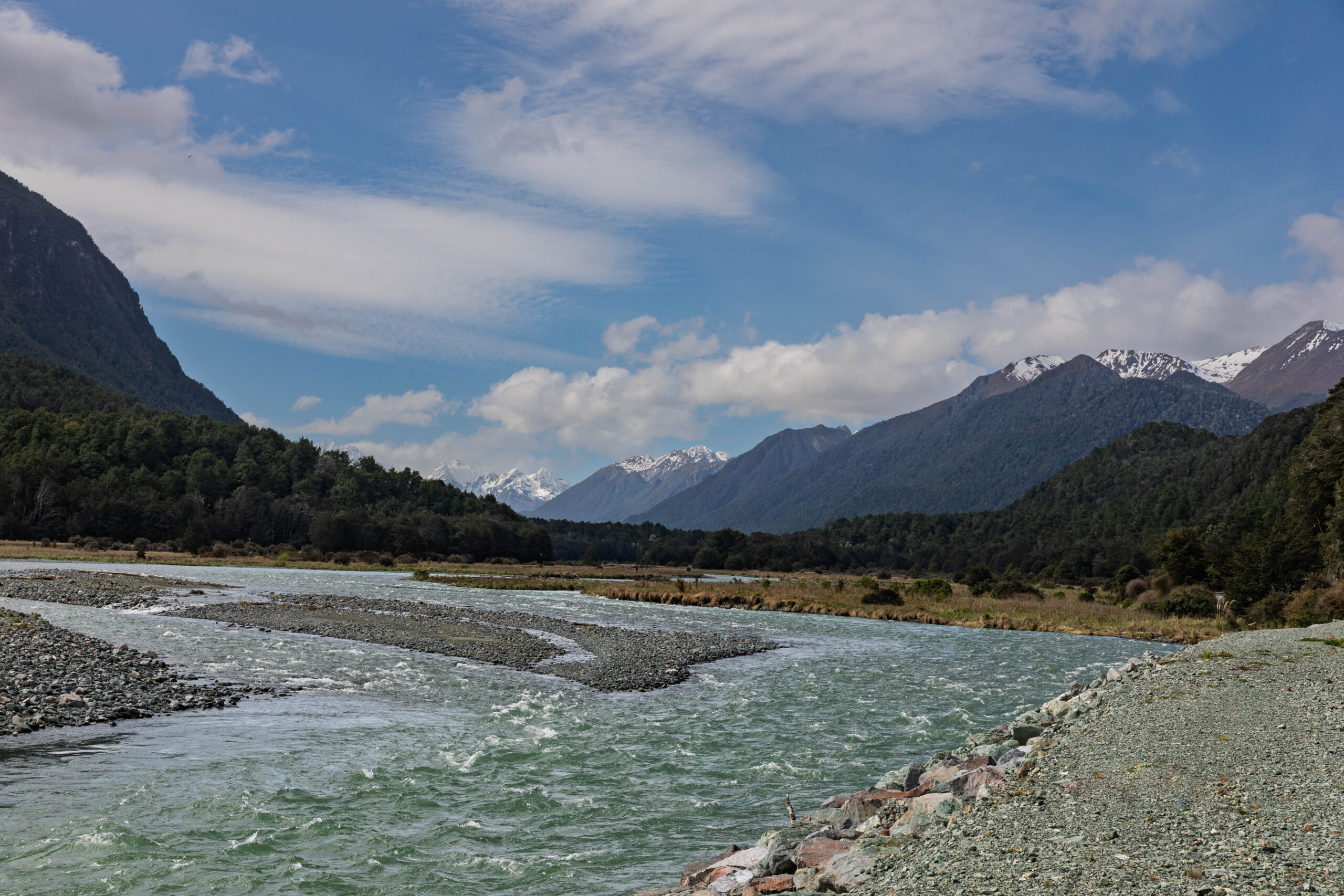 So many opportunities for photos of the amazing scenery along the Milford Road, with our last photos taken of the Eglinton river between the Totara and Walker Creek campgrounds. The weather had continued to improve all afternoon, so we very happy to be clicking away with some blue sky over the snow capped mountains.