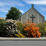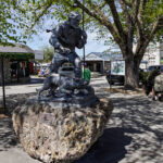 We went back outside and snapped a couple more photos of Mount Cook with ‘almost’ no cloud. Then, since we had to walk past the statue on the way to the car, tried that door again and … it opened. We were able to exit via another door onto the terrace where we tried to take photos of Sir Ed looking at Mount Cook. It’s a bit of a stretch to frame them in the same shot.