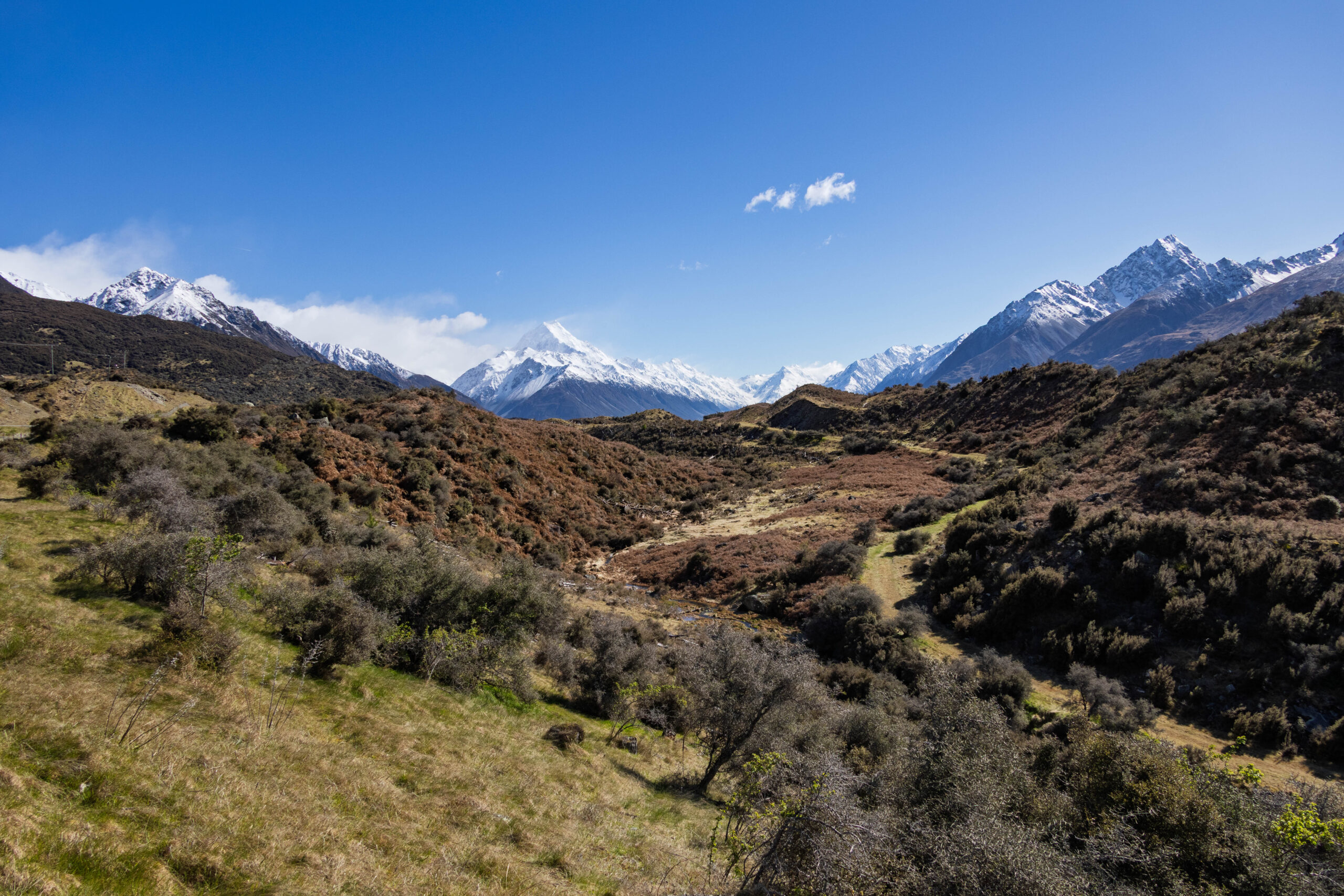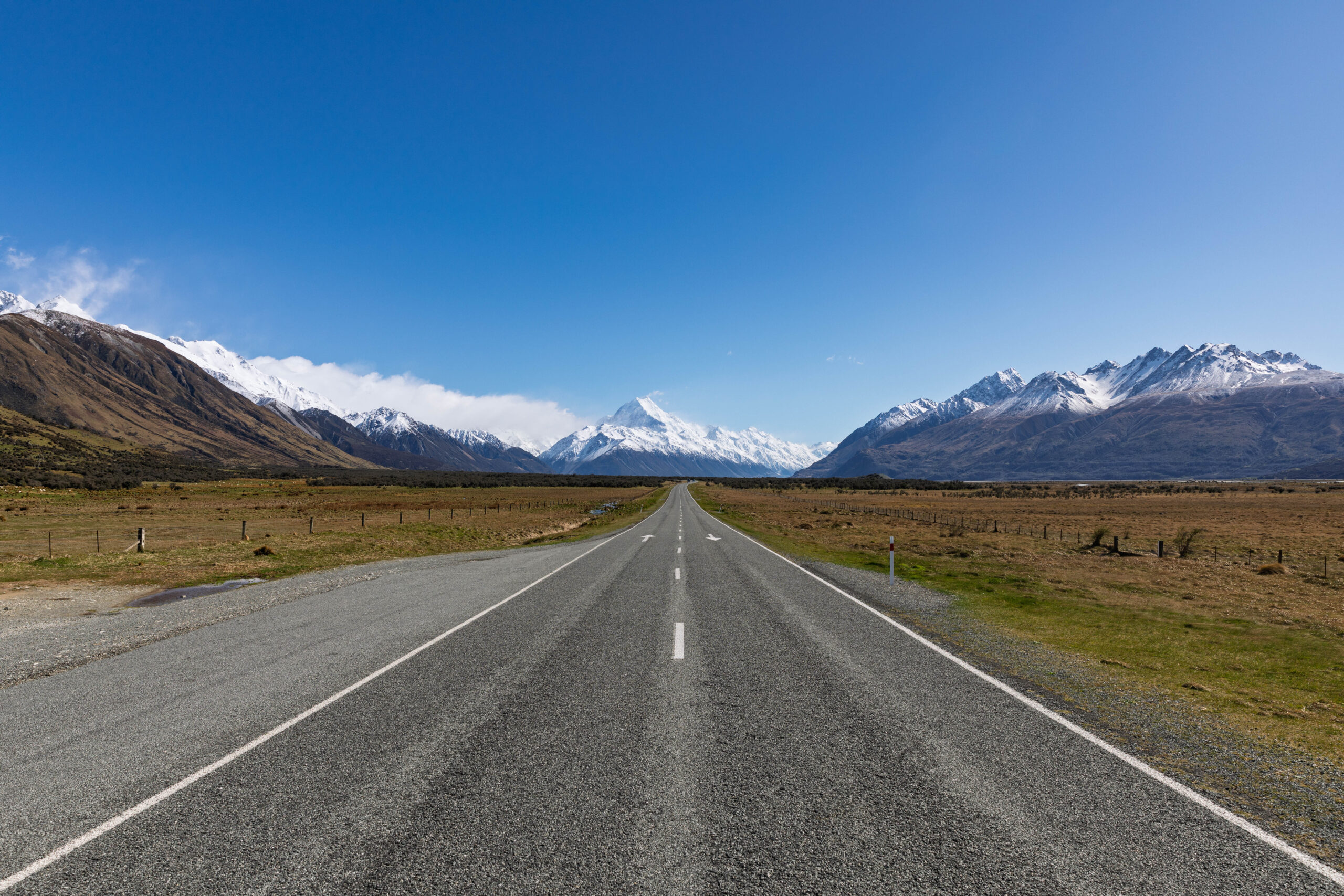 Happy to have seen Mount Cook before our departure, we set off south along Mount Cook road in VERY different weather conditions from our northbound journey. Instead of torrential rain we had blue sky and sunshine, which made for a much less harrowing trip. So, that was a big plus for today but, on the minus side, we were heading towards Christchurch rather than the West Coast (Franz Josef) as per our spreadsheet.
