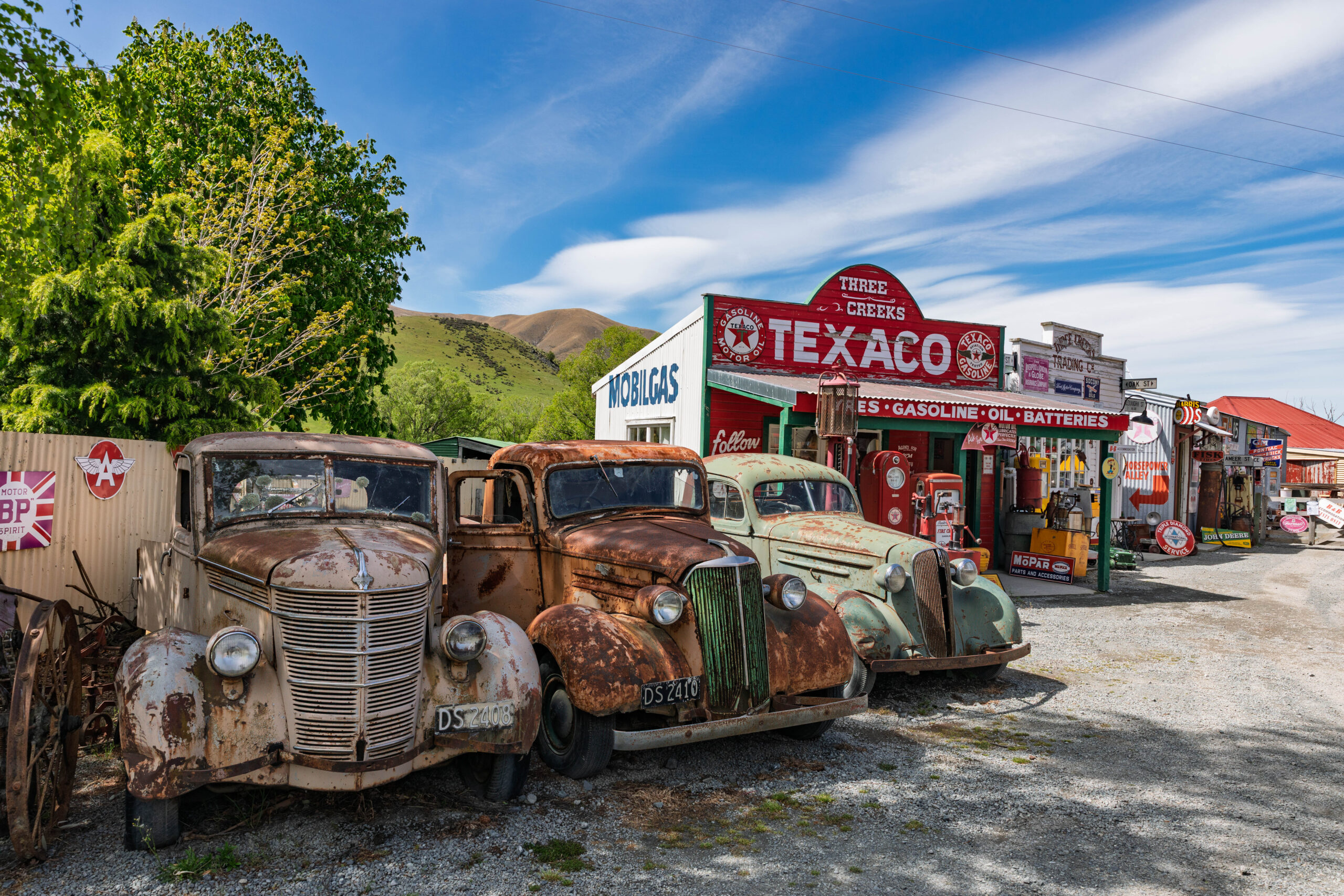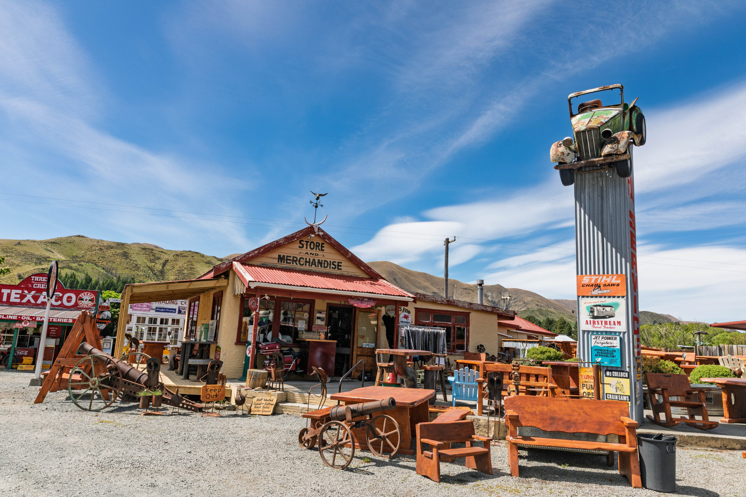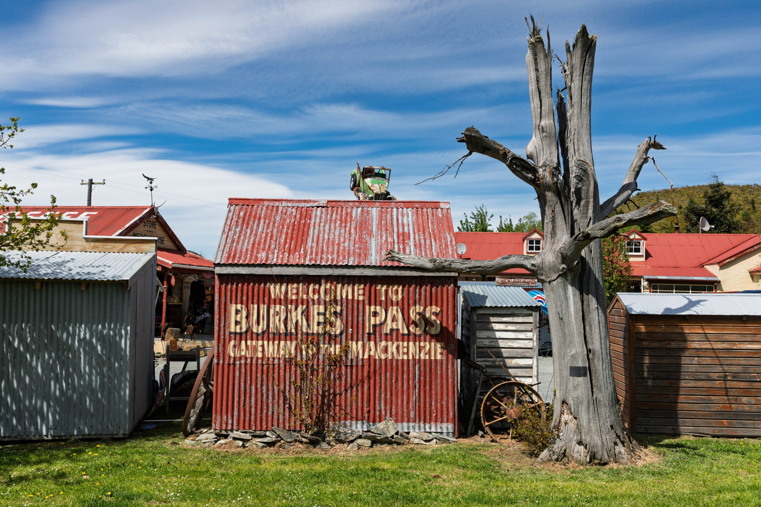 Finally, after yet another photo of That Mountain from the Punatahu Campground viewpoint, the SatNav was set for Christchurch and we were properly underway for the day. We drove straight through Lake Tekapo figuring it would be crazy busy today due to the holiday weekend. We made our first stop at Burkes Pass, which was home to an eclectic mix of old buildings and motor vehicles.