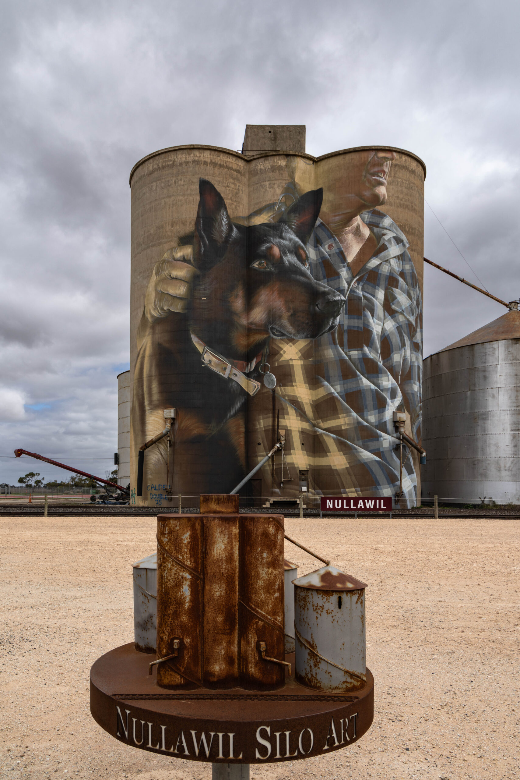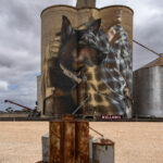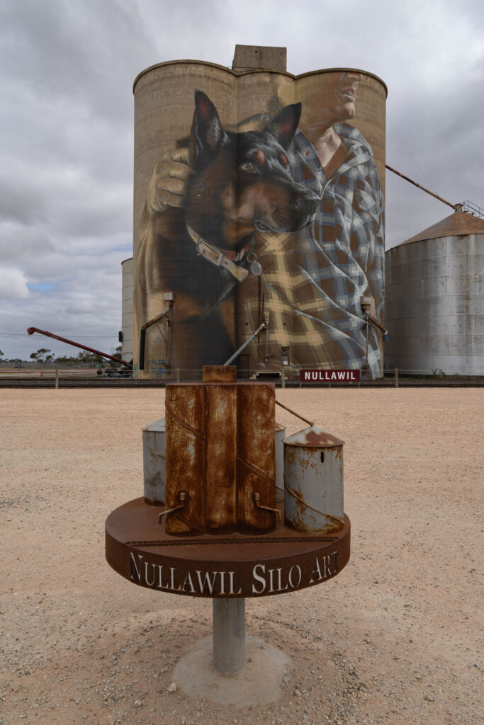 Our next stop was a very short leg stretch and photo op at the silo art in Nullawil. Although we have seen this silo art before, we stopped again for a photo of Jimmy the kelpie dog painted by Smug in July 2019.