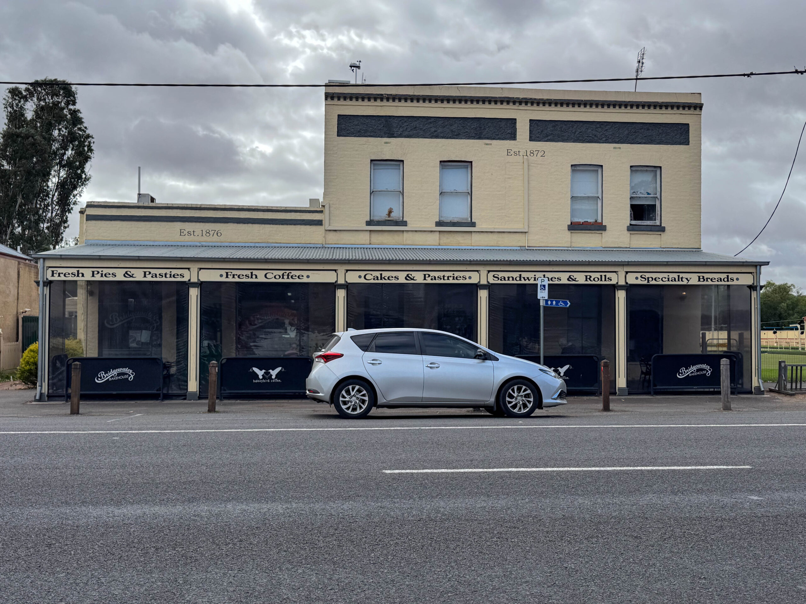 After clearing the city we headed north west on the Calder Highway. Our original plan was to scooch across to the Sunraysia Highway to purchase award-winning vanilla slices at the Birchip Bakery. Fortunately, a couple of days ago, Bernie thought to check if the bakery opens on Sunday. Nope, they do not. Undeterred in our pursuit of vanilla slices for morning tea on day one of our holiday, we stayed on the Calder Highway and bought our snot blocks at the Bridgewater Bakery. This bakery is also a past winner of Victoria’s (Australia’s?) Best Vanilla Slice so they were an acceptable substitute, ha, ha.