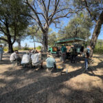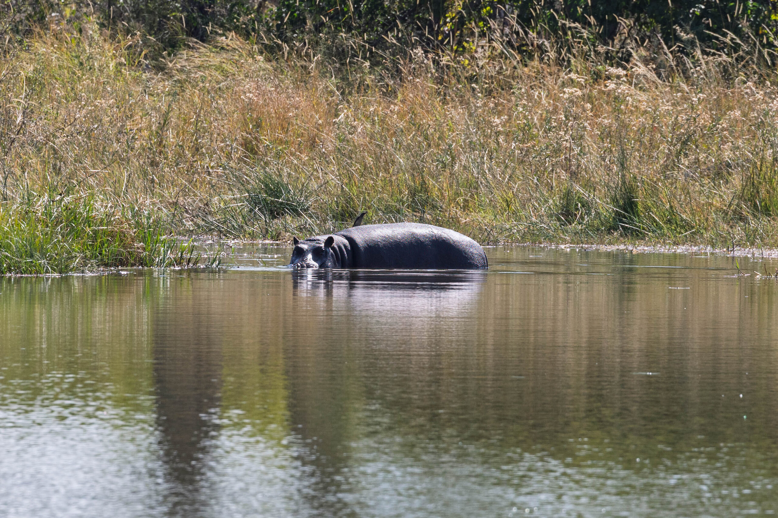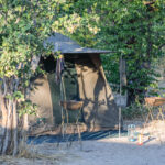 Our last sighting before taking a lunch break was a yellow-billed stork. Once again, Solomon dropped the side of the truck, then spread a tablecloth on it before putting out today’s lunchtime buffet. Yet more delicious food supplied by the excellent chef in charge of our camp kitchen. We lunched in the camping area near the permanent lagoon Xaxanika, so we were spoiled with facilities again … after Wian checked to make sure there were no baboons lurking inside. Wow, this time we had windows and natural light but … it was BYO paper. Wian fixed us up with that too! He’s looking after us very well.
