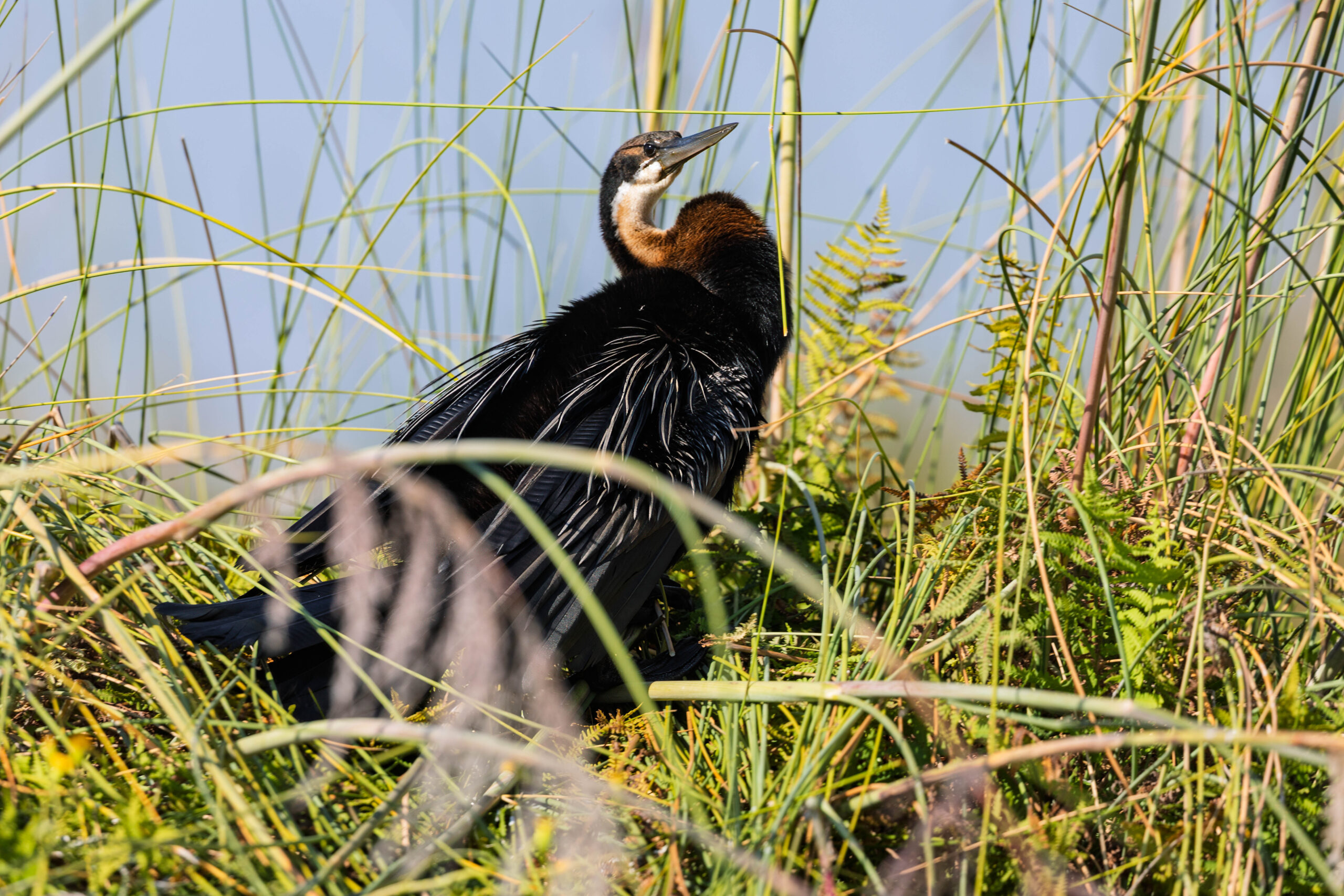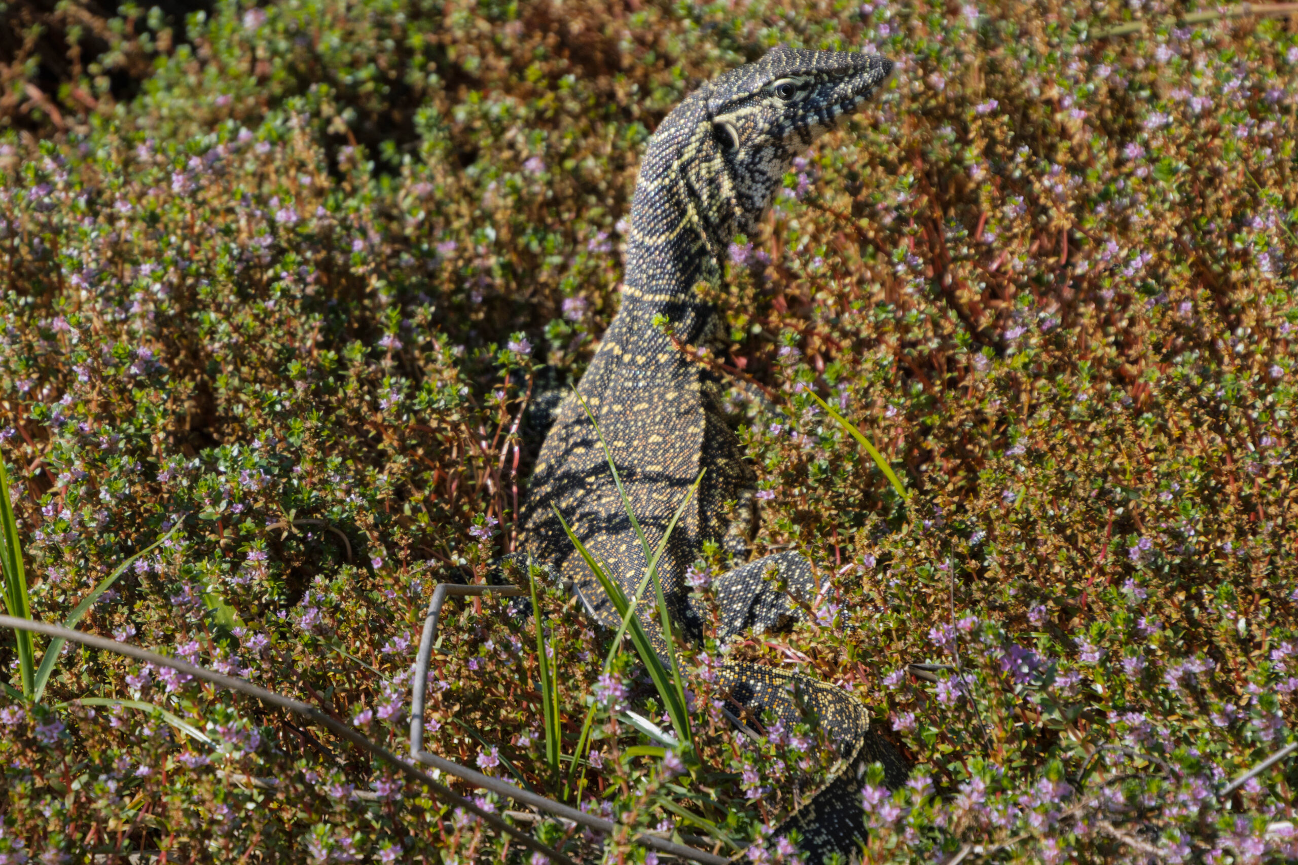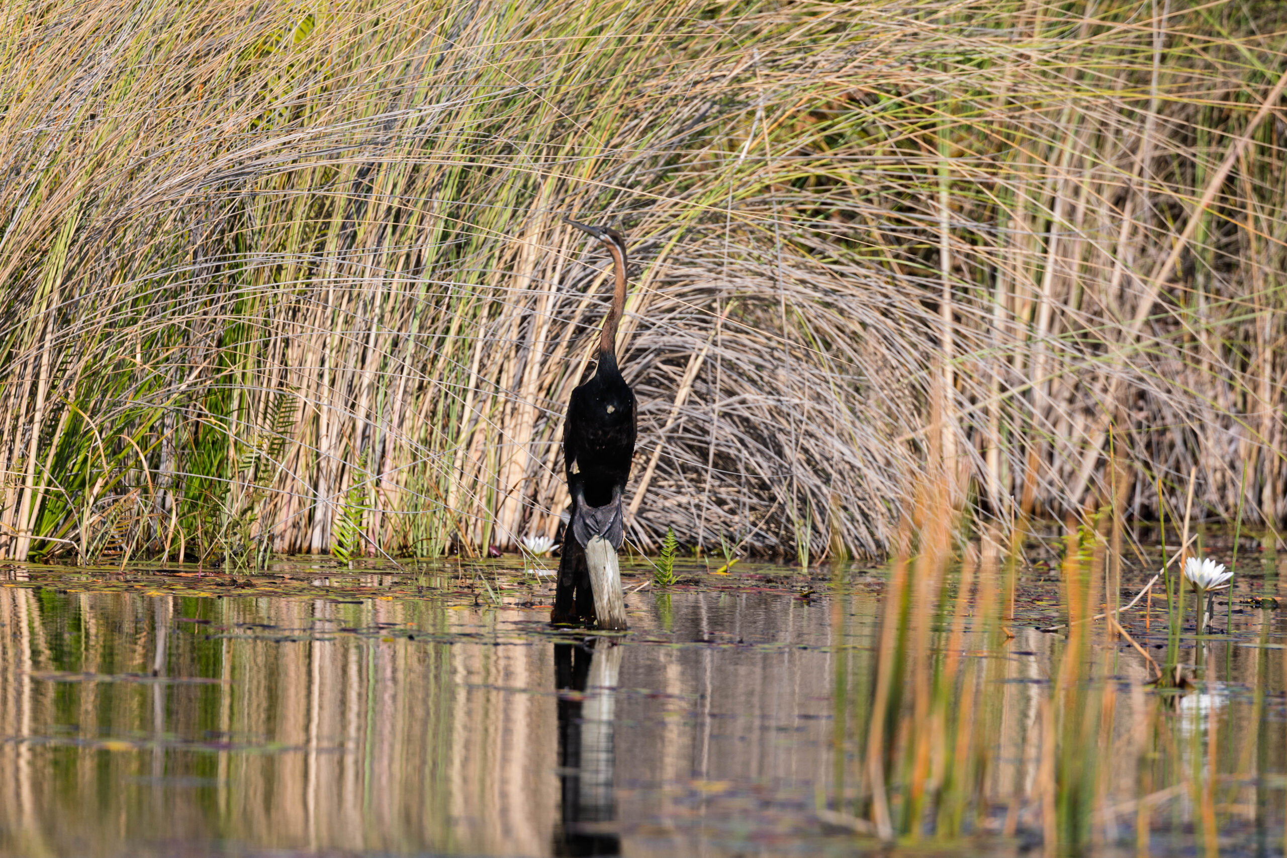 With lunch finished, it was time to take a boat cruise with Blade on the lagoon. We wound our way through the reeds with Blade pointing out a water monitor, small crocodile and white, lilac and yellow water lilies. While we were still making our way out to the lake we spied another water monitor, a much larger crocodile and an African darter (aka snake bird).