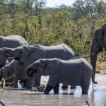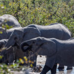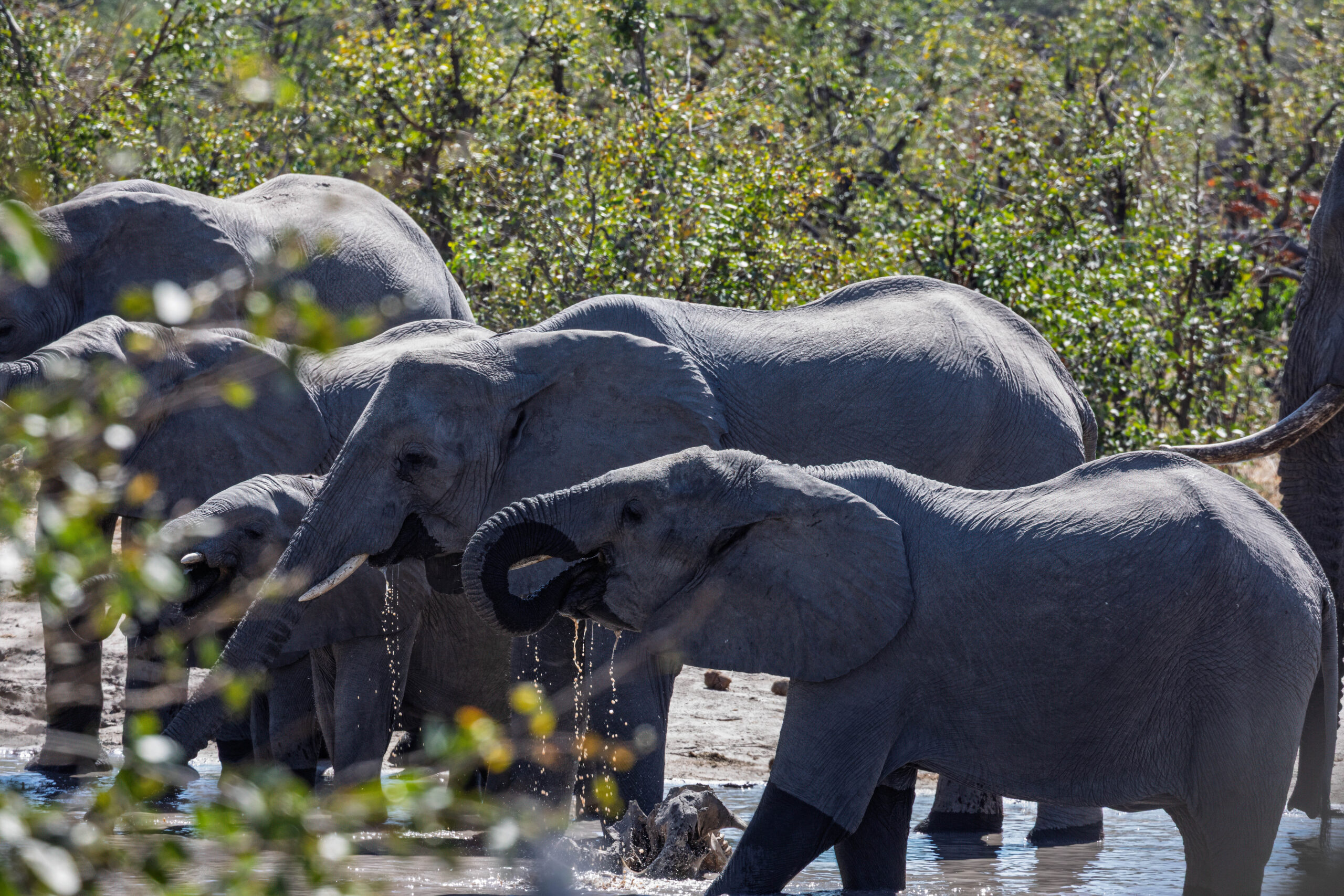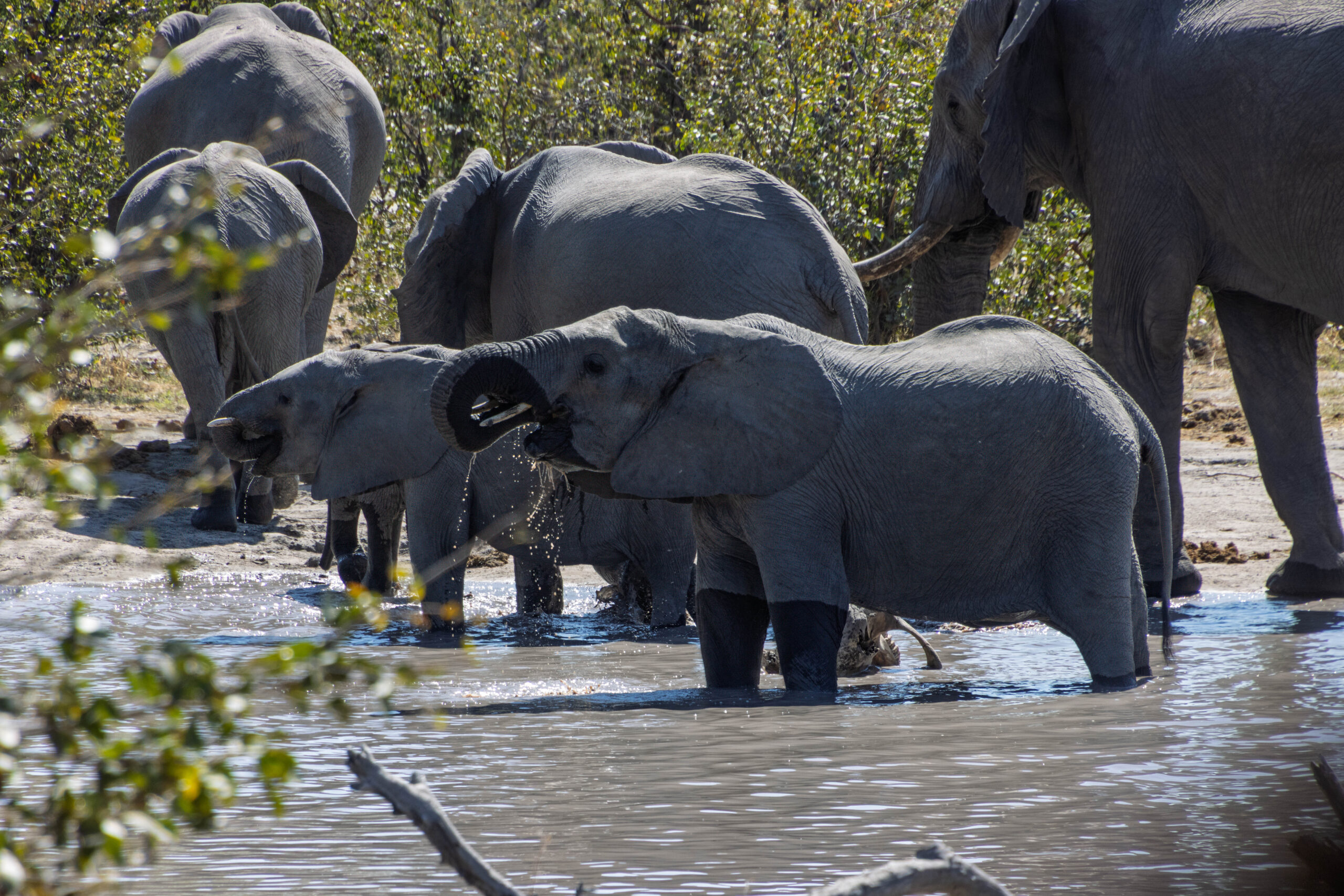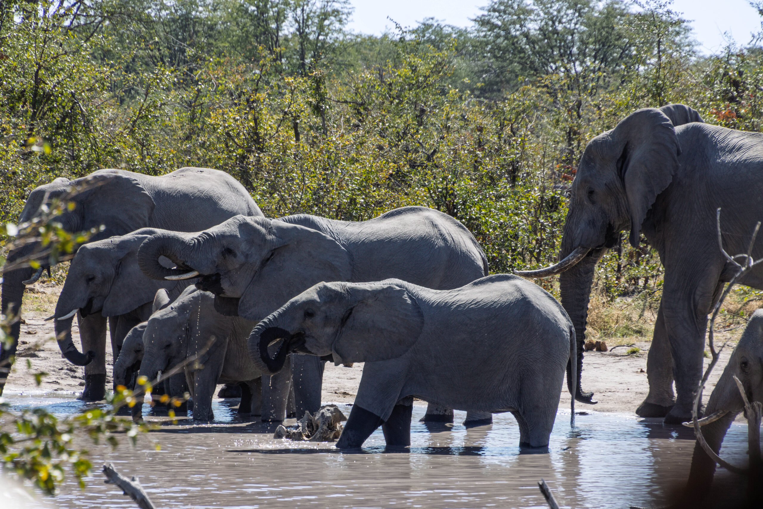 As we continued our drive we saw more giraffes, a pair of females and a tower of giraffes and common impala aplenty. We saw elephants at a waterhole and giraffes, giraffes, giraffes. Still not sick of giraffes! We stopped and Wian and Solomon said they needed to check the tyres. Ahem, that would be a euphemism for use the bush toilet!