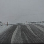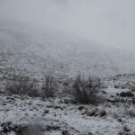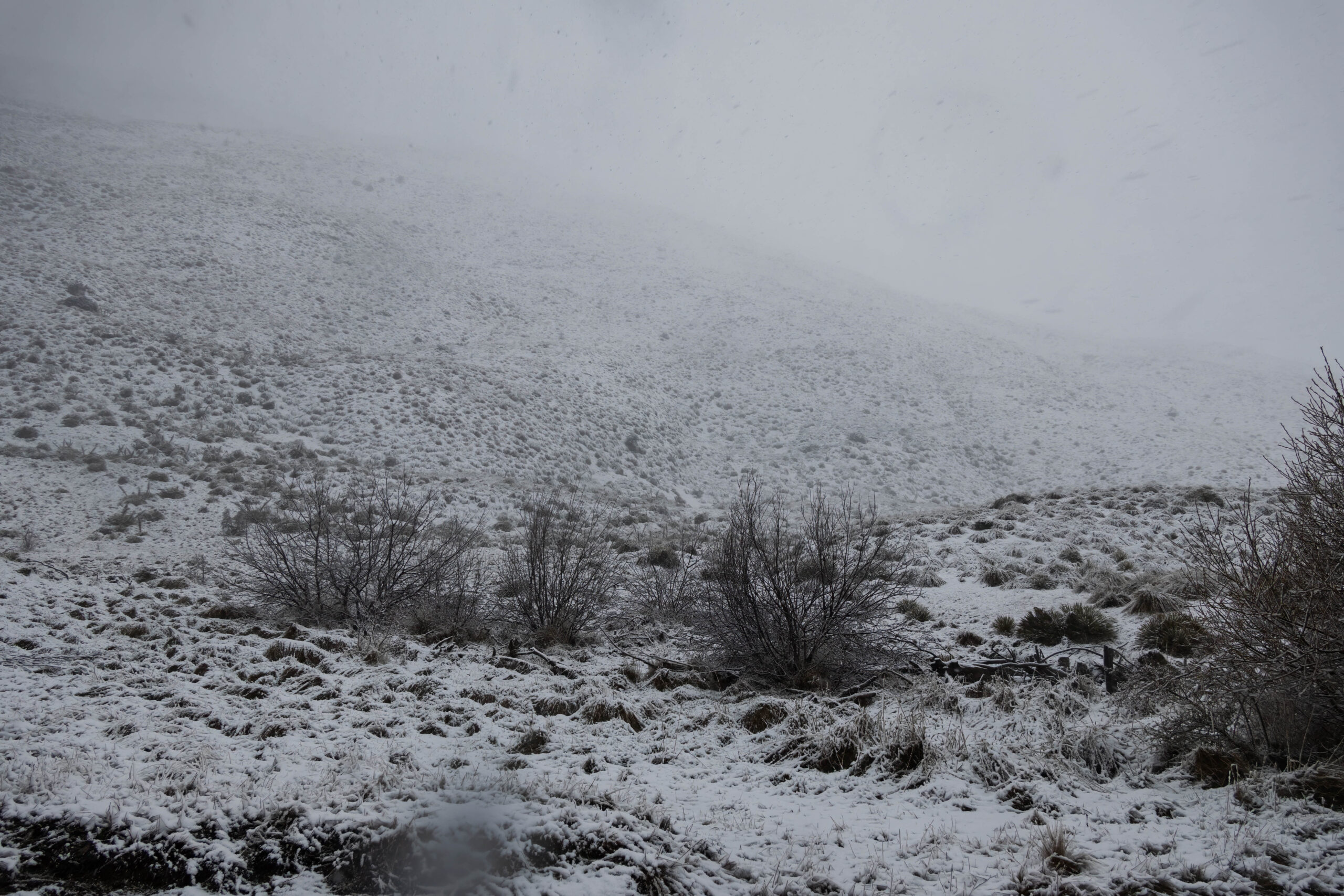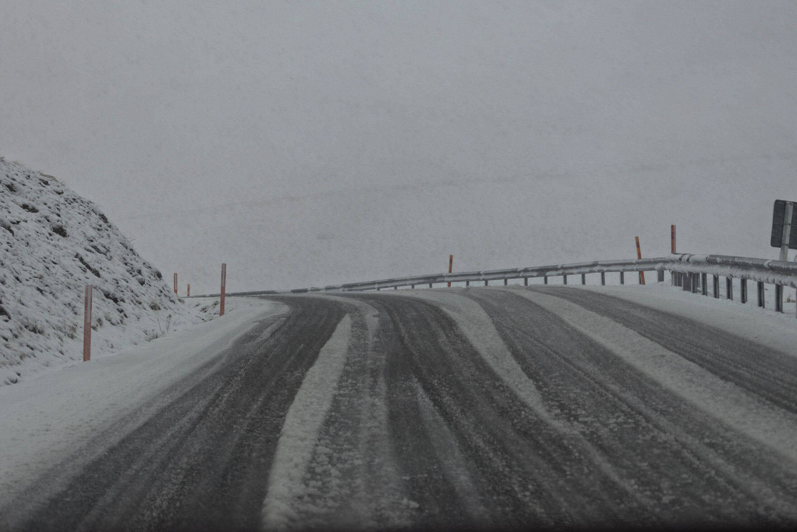 We drove to Arrow Junction where we took a left onto State Highway 6 then, soon after, another left onto Crown Range Road. What a ride it was as we negotiated a narrow road, with hairpin bends, up into the Crown Range. As our elevation increased, the rain turned to sleet and then we rounded a corner to find ourselves in falling snow, with snow slush on the road and a tailback of cars. Hmmn, cars ahead of us were making the decision to turn around, rather than continue in these appalling conditions.