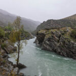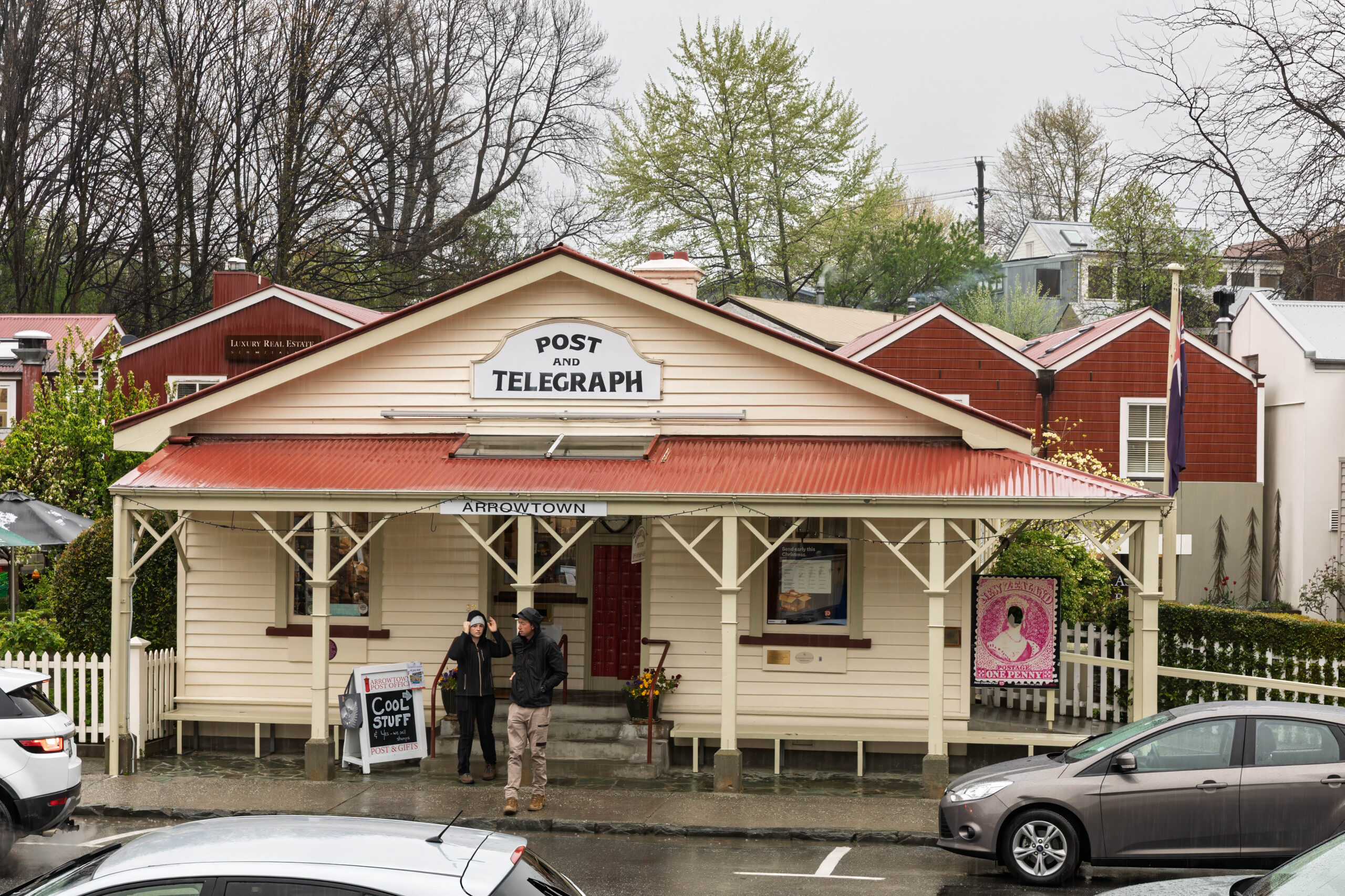 We headed out of town on Gorge Road heading for Arrowtown. We crossed the Edith Cavell Bridge over the Shotover River, and pulled into the car park for the Shotover Jet. Having already done jet boating yesterday, we had no intention of taking a ride, we just thought we might be able to take a photo of the Shotover River and/or the bridge. Nope, the infrastructure associated with the Shotover Jet pretty much obscures the river at that point. You want to see the river, you have to ride … or at least be prepared to get out of the car. With the rain falling heavily, neither of us felt inclined to wander around getting wet, looking for a photo vantage point.