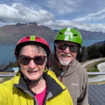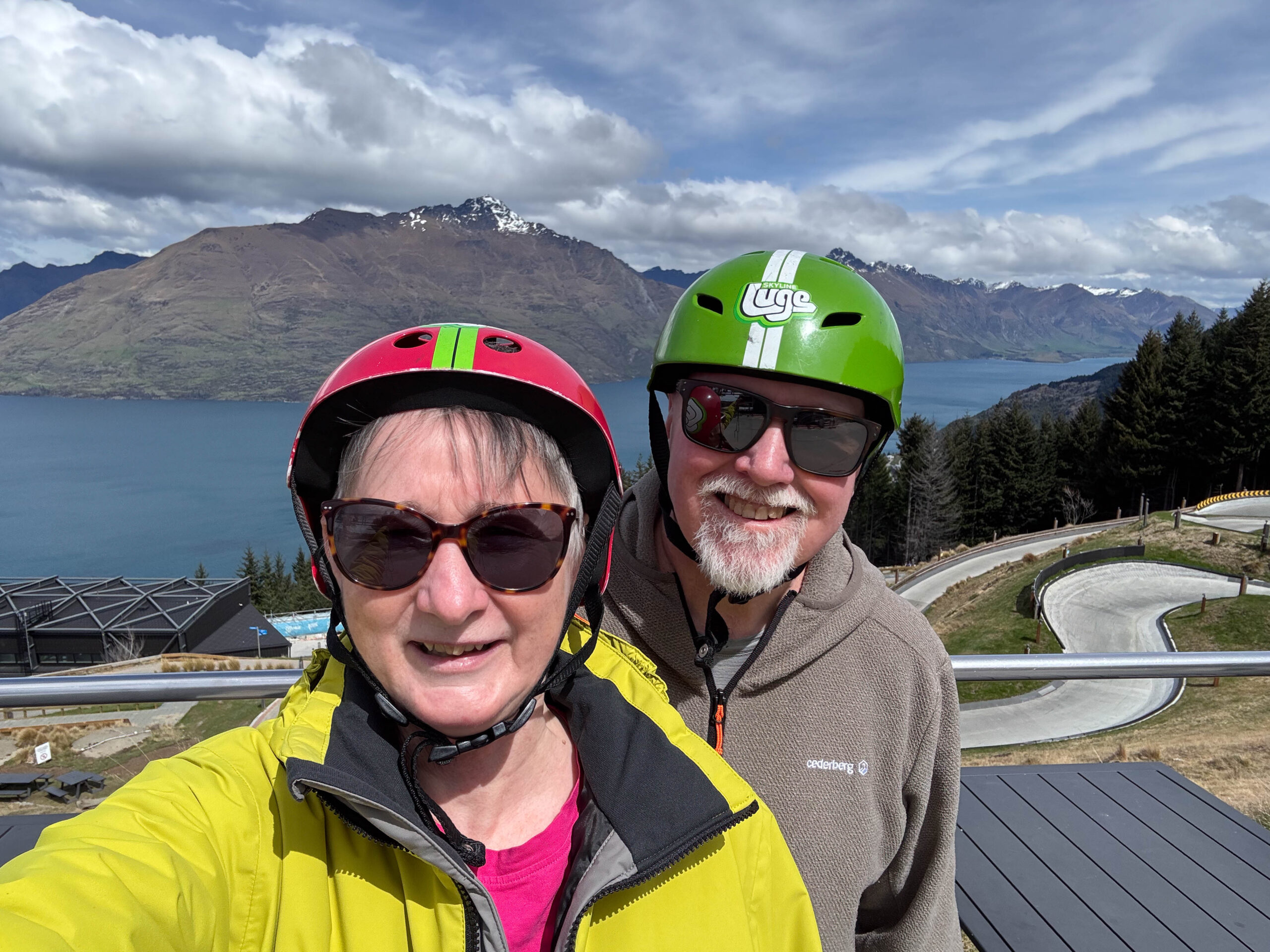 At the end of our third run we checked at the Photo Booth BUT these photos are not free, they are ridiculously expensive, so we decided that we really didn’t need photos of us riding the chair lift or hurtling down the luge track. At this point we could have departed via the stairs, but we decided to ride the chair lift to the top again and walk down the hill. Before we turned our helmets in, we took a selfie with the luge track, the lake and the mountains behind us. Cheapskates!