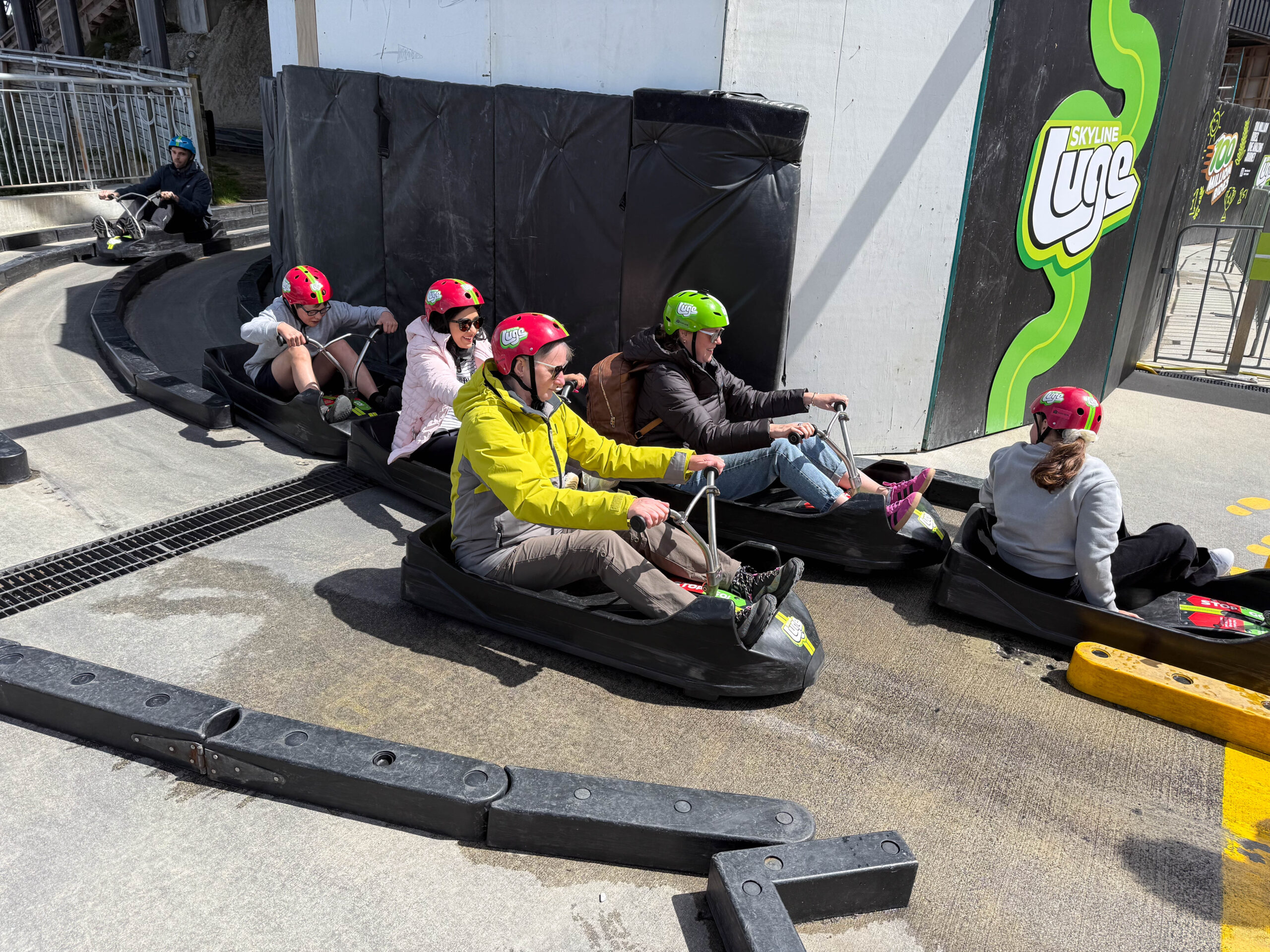 As first timers, we were shown to our luge carts and given some basic instruction. Push forward to go/pull back to stop. We had to demonstrate that we could accelerate, brake and steer and then, we were off on our first 1.6km run down the track. Actually, there are two tracks and on our first ride we took the track on the left. It was great fun, zooming down the concrete track, although I didn’t zoom quite as fast as Bernie. Have to say though that I was nowhere near as slow as some riders, even if not as fast as the go-faster boy!