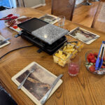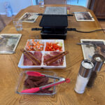 For dinner tonight, Robin and Sandra experimented on us with their new raclette grill. Invented in Switzerland, it’s sort of a variation on fondue and popular throughout Europe. Instead of dipping items into the fondue pot, you cook your chosen items on the hot plate or stone cooktop, then transfer them onto your plate. At the same time you put raclette cheese in a little pan and melt it under the grill, then poor the melted cheese over your cooked items. What’s not to like about a cheese forward meal??