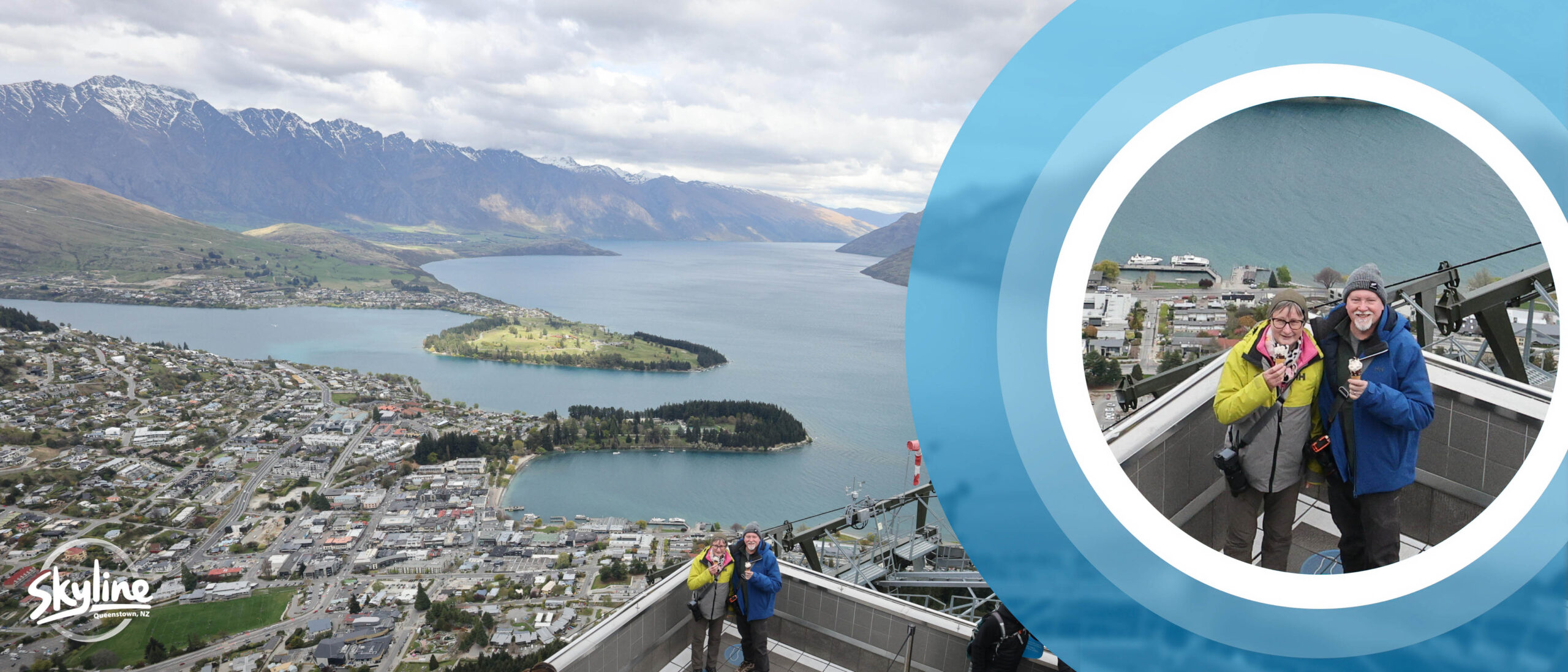 After settling in, we drove over to the Skyline Gondola to take a ride up Ben Lomond. We purchased packaged ice-creams (Tip Top Trumpets was all that was available!) and ate them out on the balcony overlooking the lake. As we walked out onto the balcony we were accosted by a young lady, asking us if we wanted to have our photo taken for free. Oh, OK, we’d already rejected the photo op at the bottom of the gondola, but decided it would be a good opportunity to get a photo of us eating ice-cream without it being a terrible selfie, ha, ha.