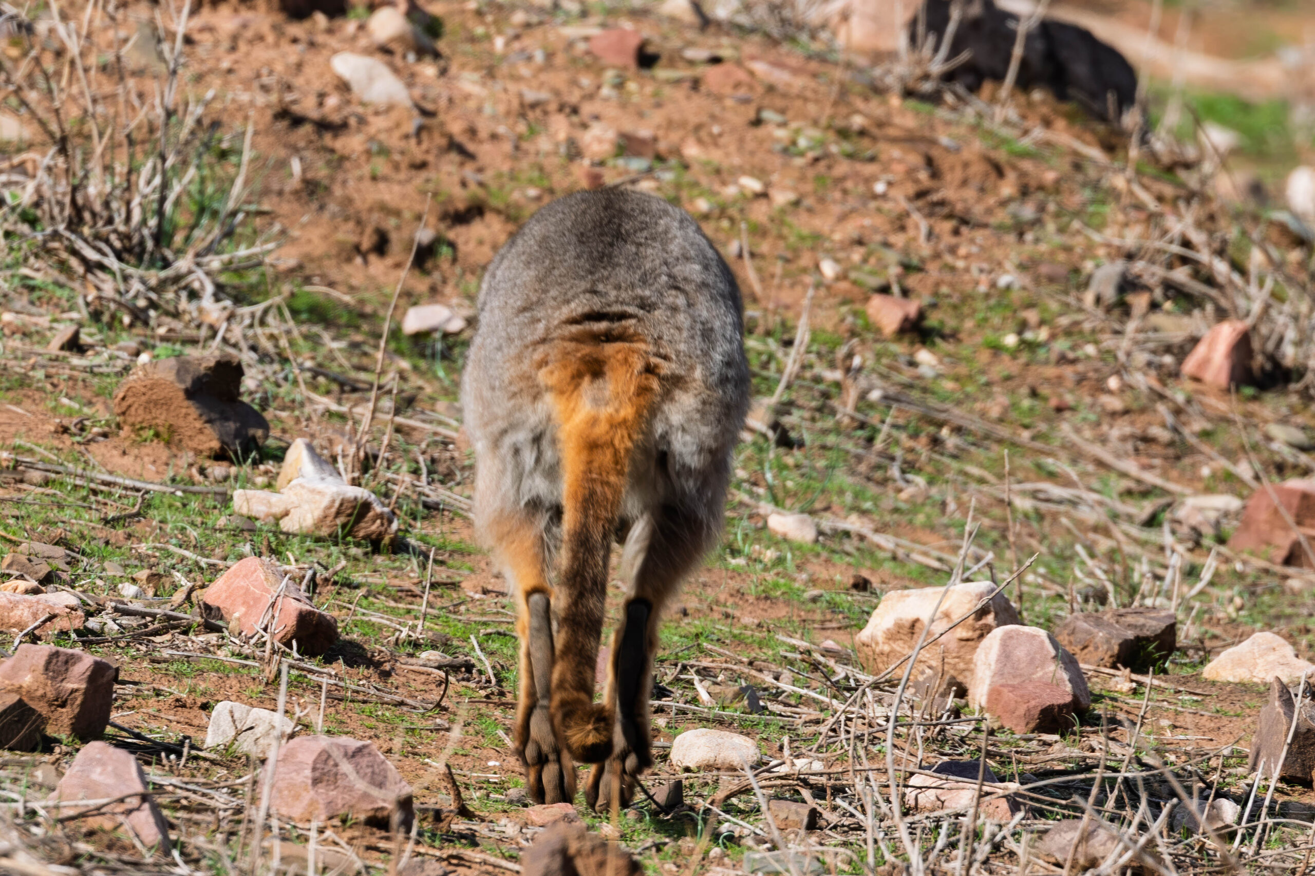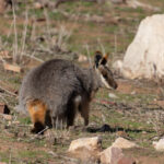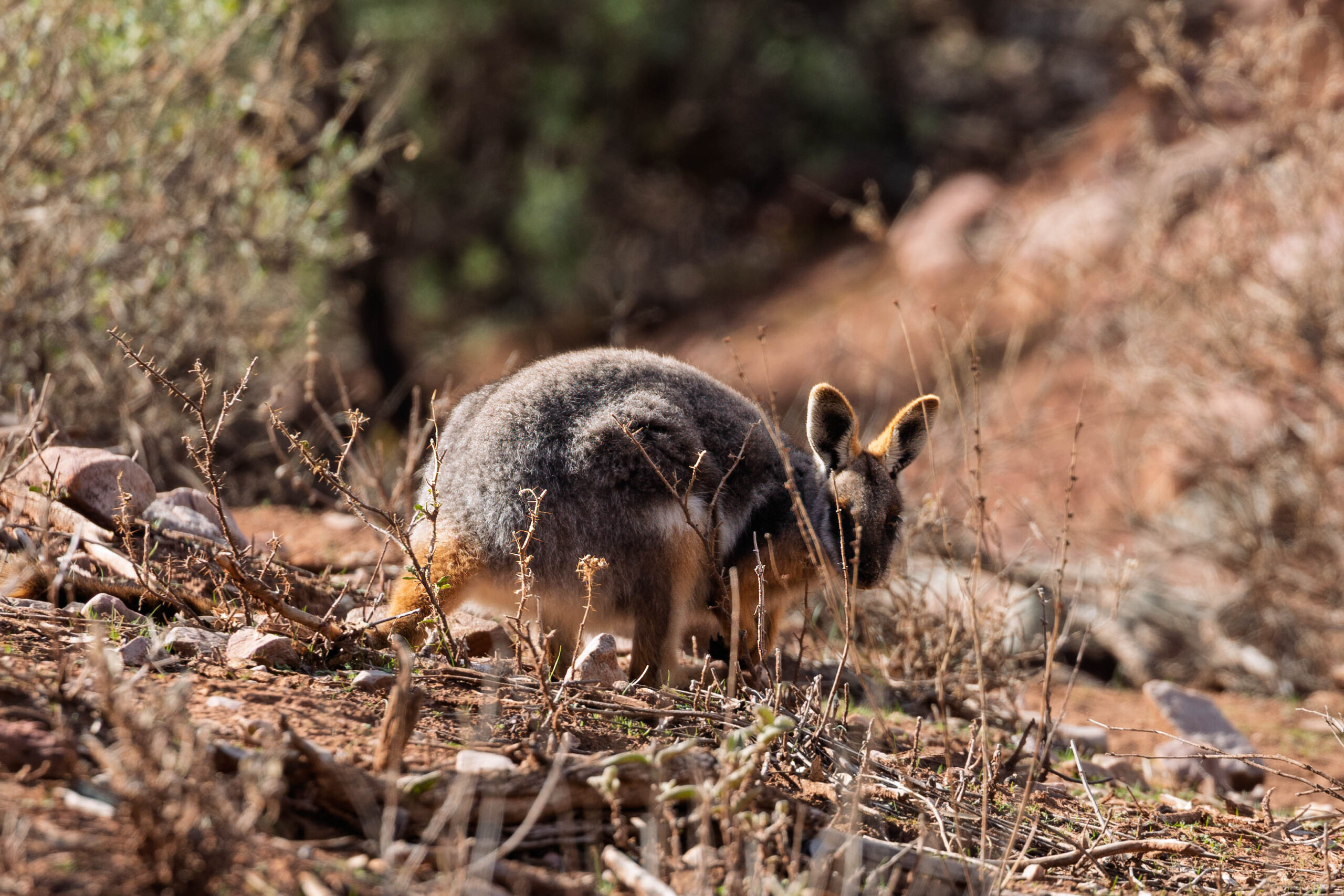 A local wandered back up to the road, the owner of the only other car in the car park. He shared with Bernie that there were two wallabies grazing on the grass nearer the river. OK, not on the rocks then, 180 degrees from where we were squinting up into the sun trying to see them on the rock scree, ha, ha. We quietly, quietly made our way along the road to try to see the wallabies. In the end we were lucky enough to see four of these beautiful little rock hoppers. Well, maybe only three as we might have seen one of them twice??