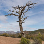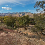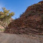 At the Bunyeroo Car Park we walked into a different section of the gorge along the Brachina Gorge Geological Walking Trail. Although we were driving the 20-kilometre driving trail, there is also an eight kilometre walking trail. We walked about ten minutes in to observe some of the geology more closely than was possible on the road. This area is considered to have one of the best records in the world of sedimentary deposition in the period between 800 million and 500 million years ago and is described as – a corridor through time. The way that the originally horizontal layers have been forced upwards over time creates spectacular scenery.