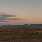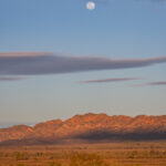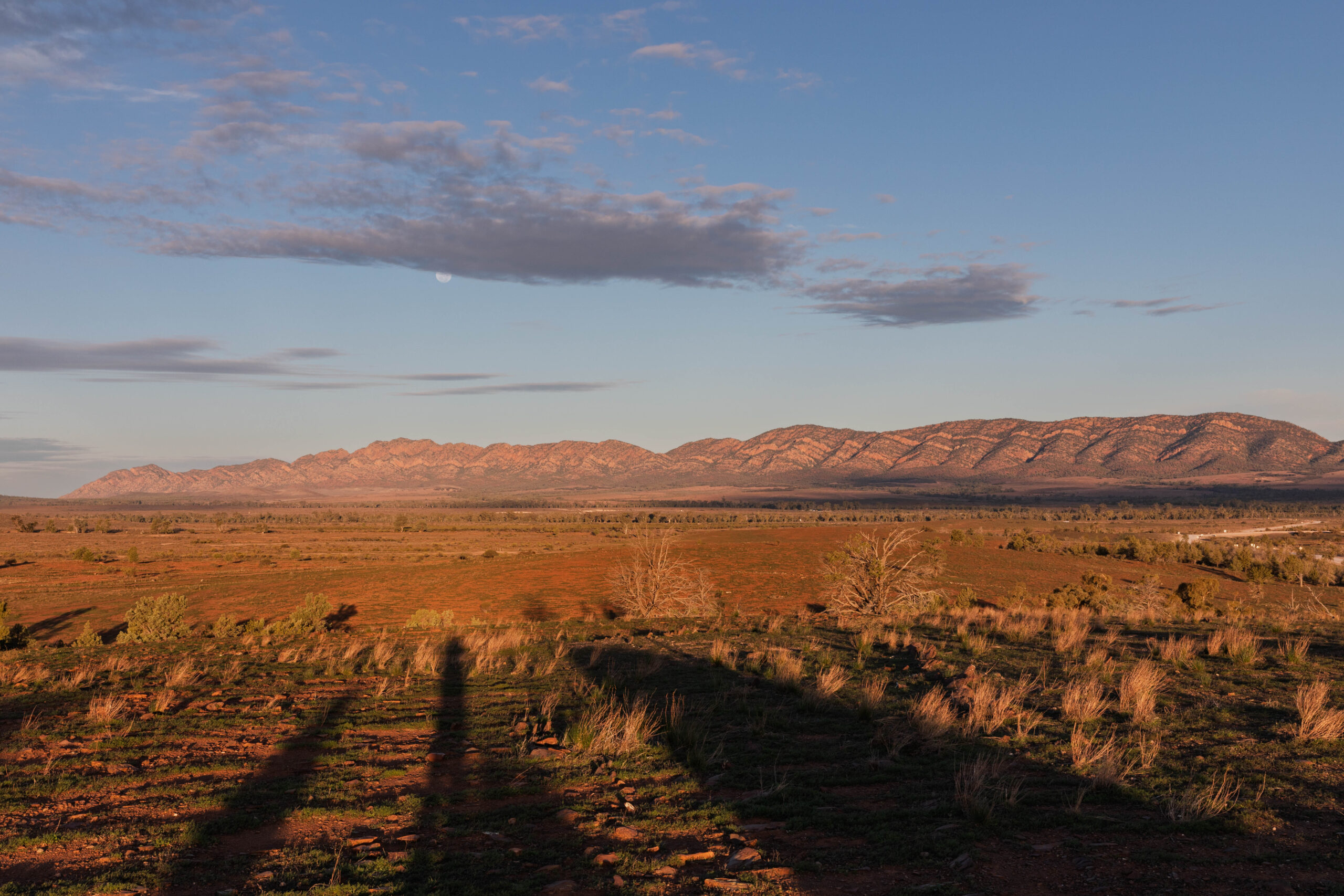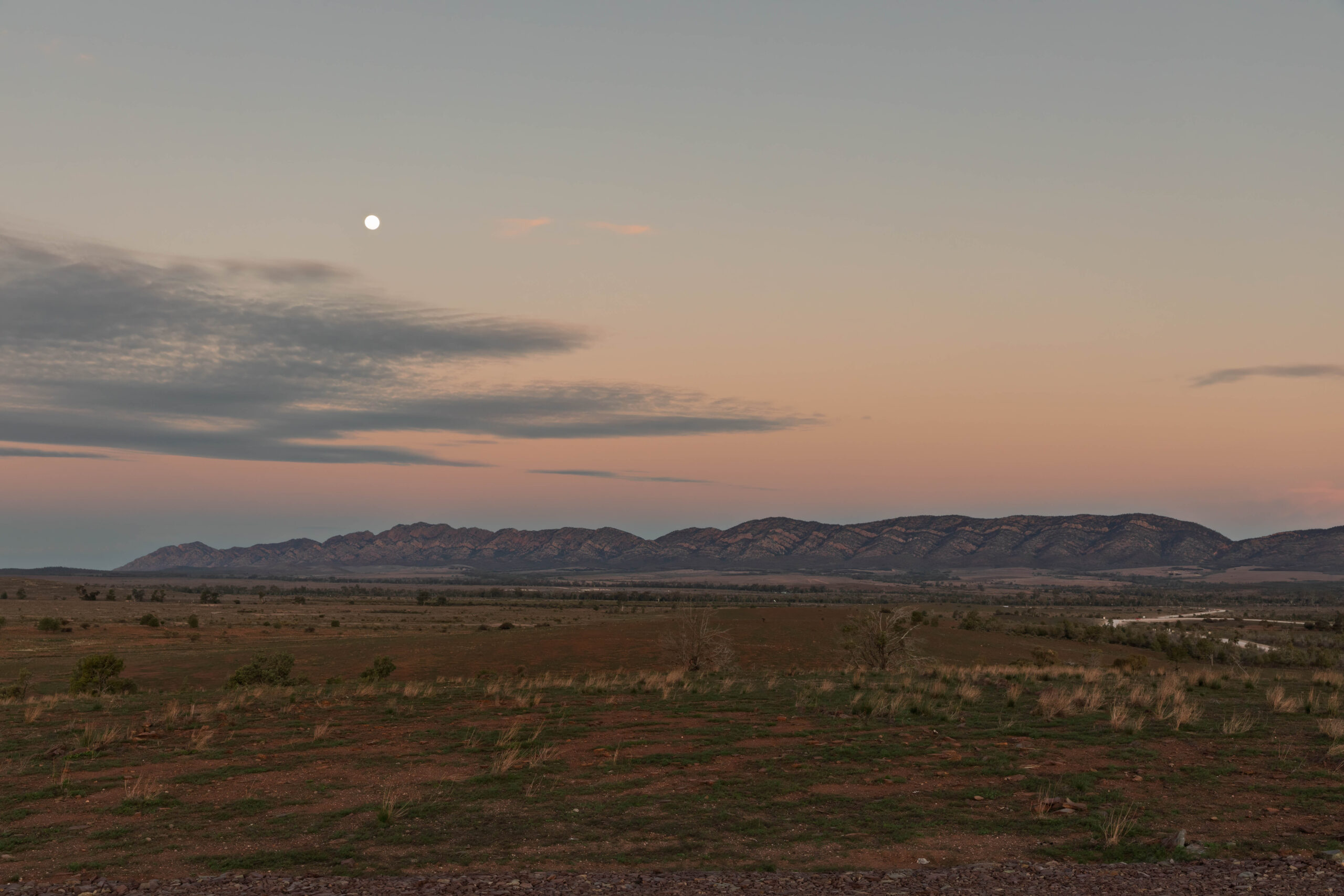It was with relief that turned into the Rawnsley Park drive. With it now getting very close to sunset we drove past our cabin to the Station Hill Lookout to watch the sun go down. Apparently this is more dramatic in the summer when the setting sun makes the Red Terraces glow even more red. It was still quite spectacular this evening with the near full moon rising above the Chace and Elder Ranges and the sun setting over Wilpena Pound.