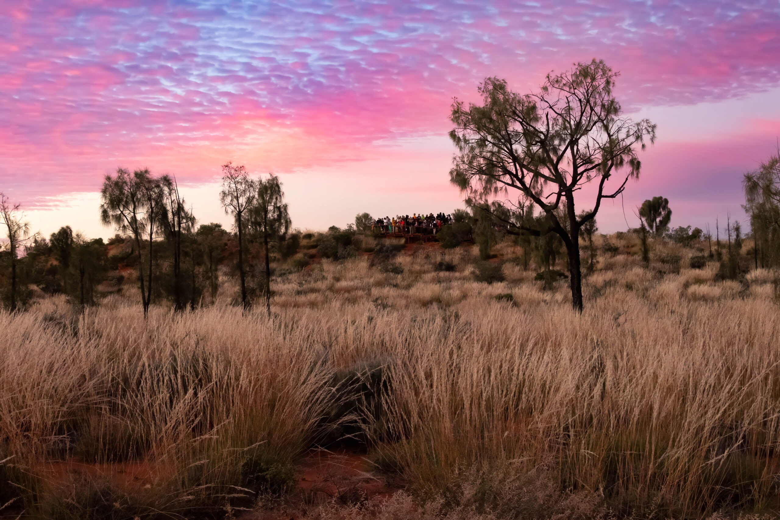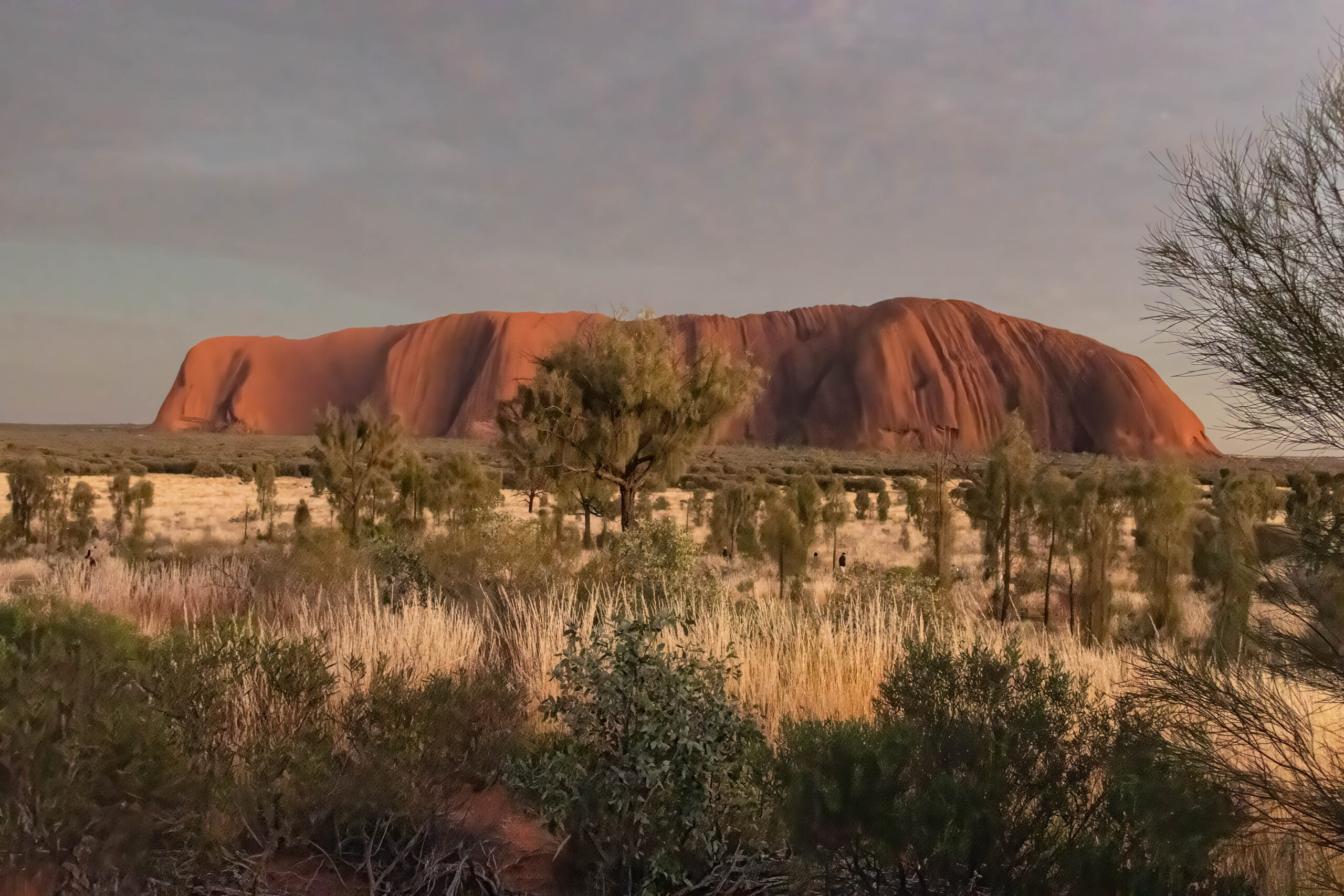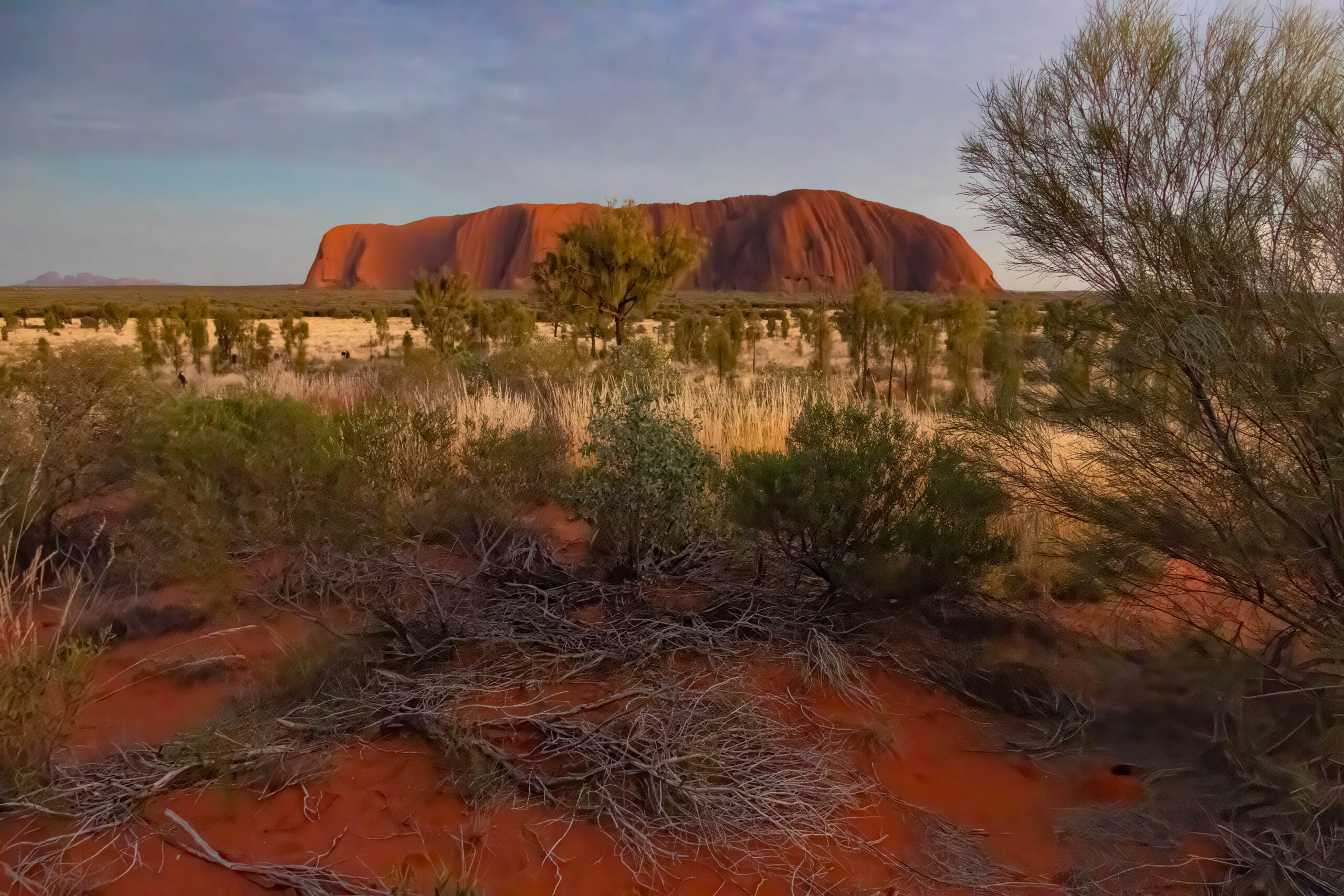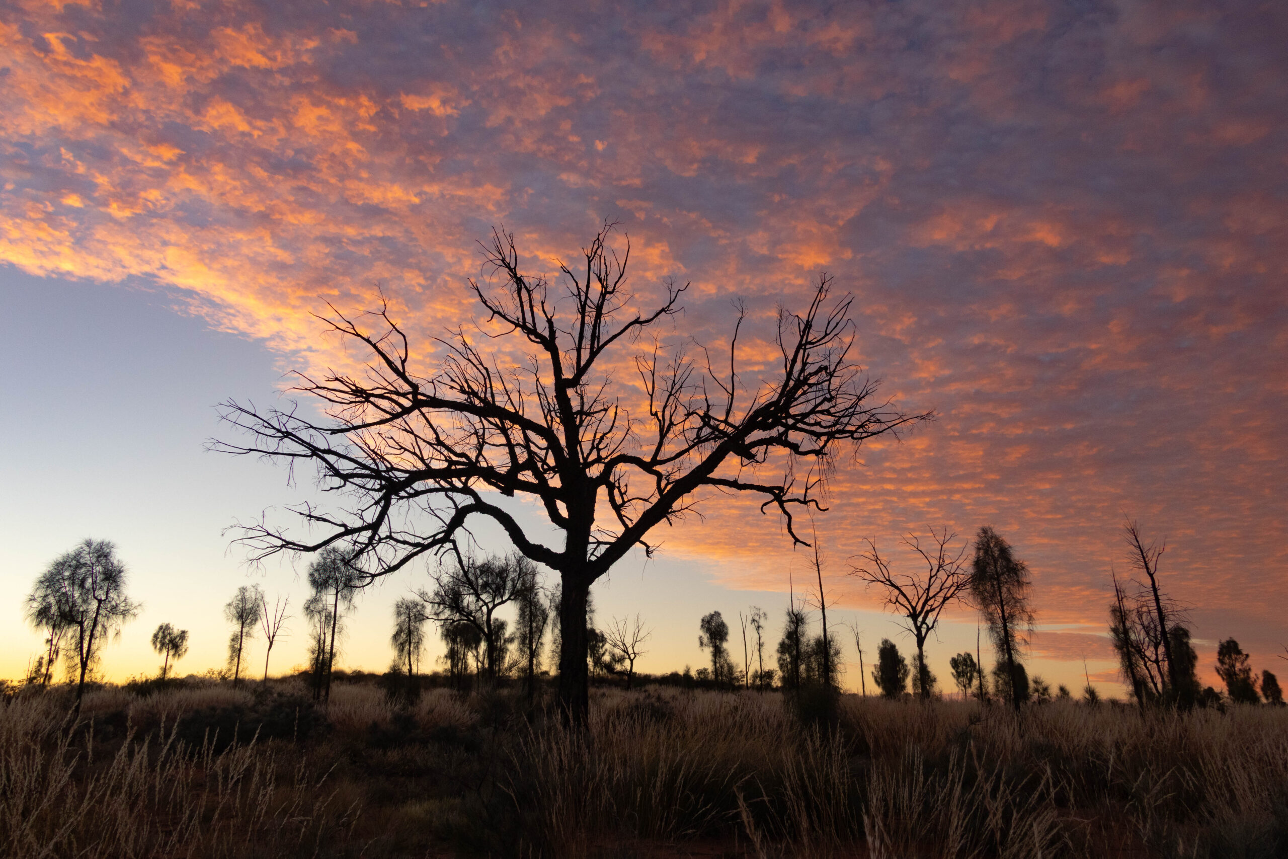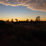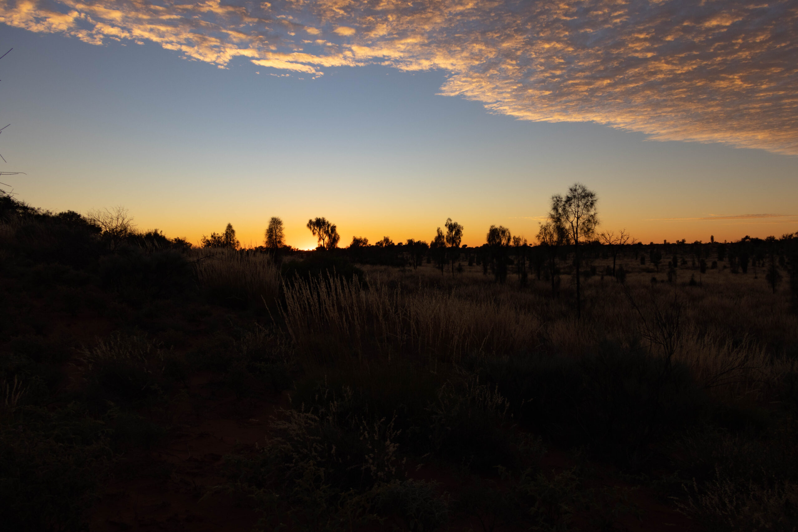 I persevered with the platform for a while but, as it became more and more crowded, I decided to head off to take some photos that would be different from Bernie’s. It seemed a bit daft for both of us to be taking almost the exact same shot and, since I was shooting hand held rather than with a tripod, I had plenty of freedom to wander around. Bernie’s processing photos at the moment, hopefully I managed some interesting shots of Uluru and Kata Tjuṯa, random gnarly trees, the interesting clouds in the east and … the sunrise? By the time 7.03am arrived it could safely be said that we have taken photos of The Rock in many different lights. I’m sure it’s going to be difficult to decide which photos are the best ones.