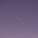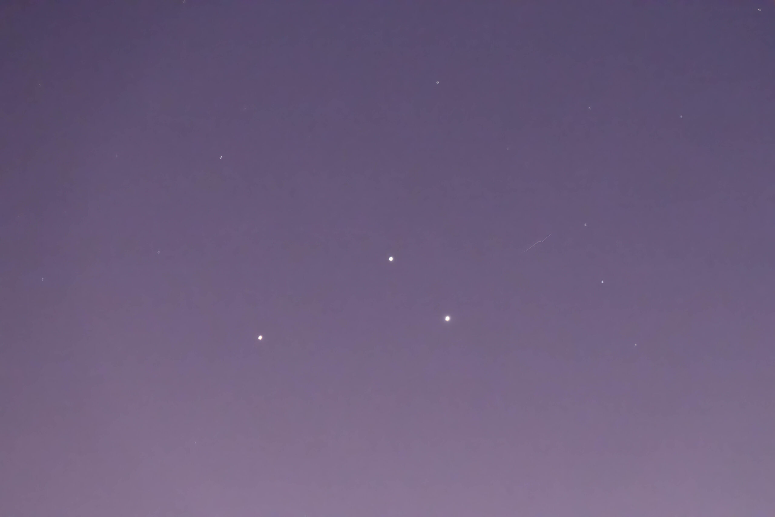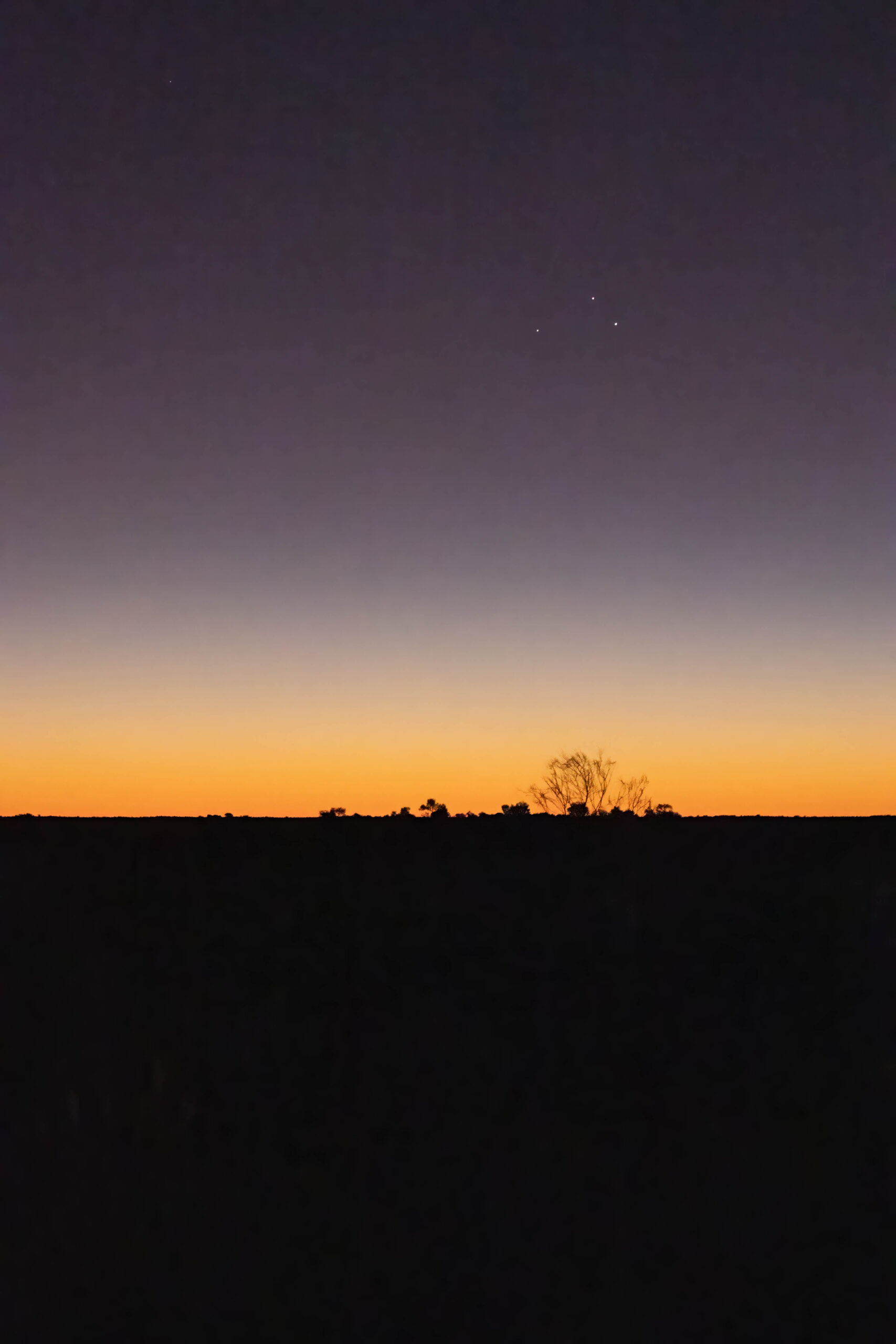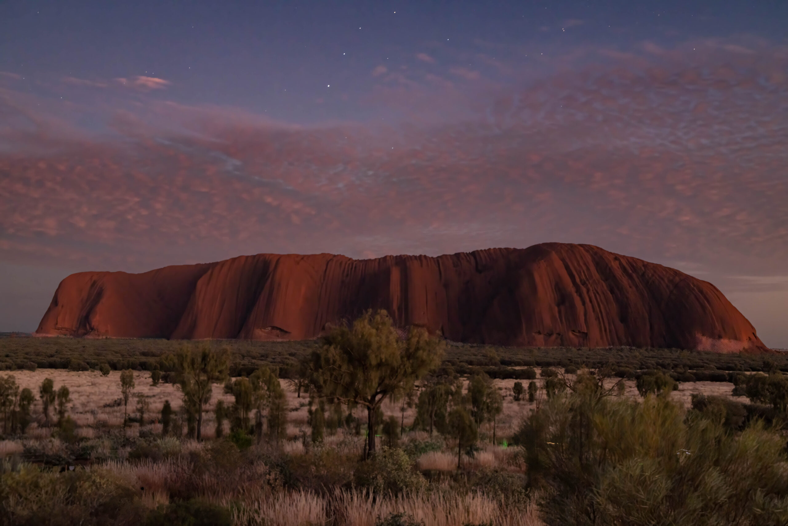 We wandered up to the viewing decks and Bernie secured himself a spot at the front of the upper deck, to set up his tripod and camera. I could see three very bright stars clustered in a triangle to the east. I used GoSkyWatch to establish that we were looking at Mars and Mercury, almost on the same plane, with Saturn sitting above them, at roughly the point above the horizon where we were expecting the sun to rise at 7.03am. Nearly an hour until ‘the moment’ the sun rises but in the meantime Bernie was happy to snap away taking long exposures of The Rock.