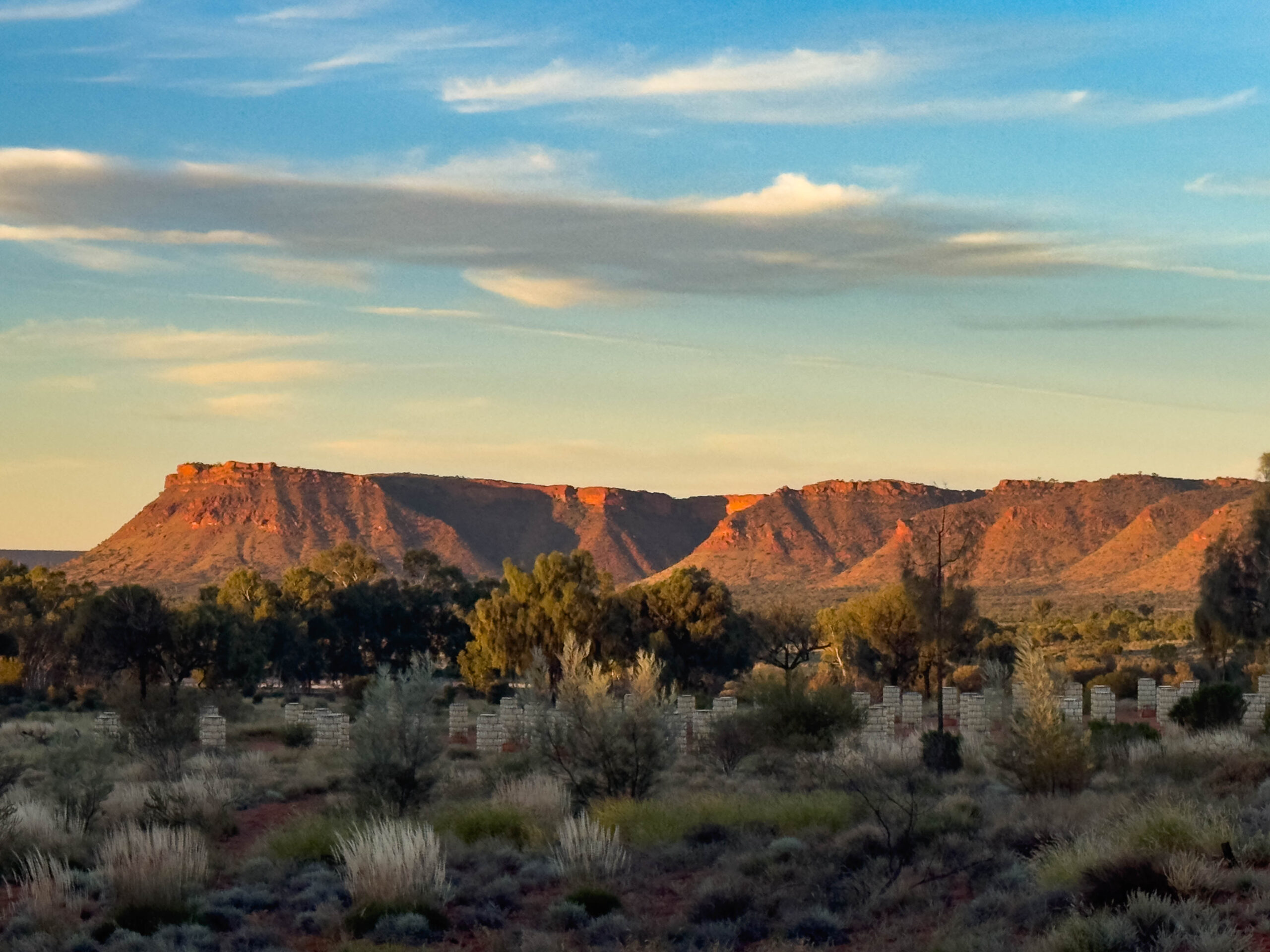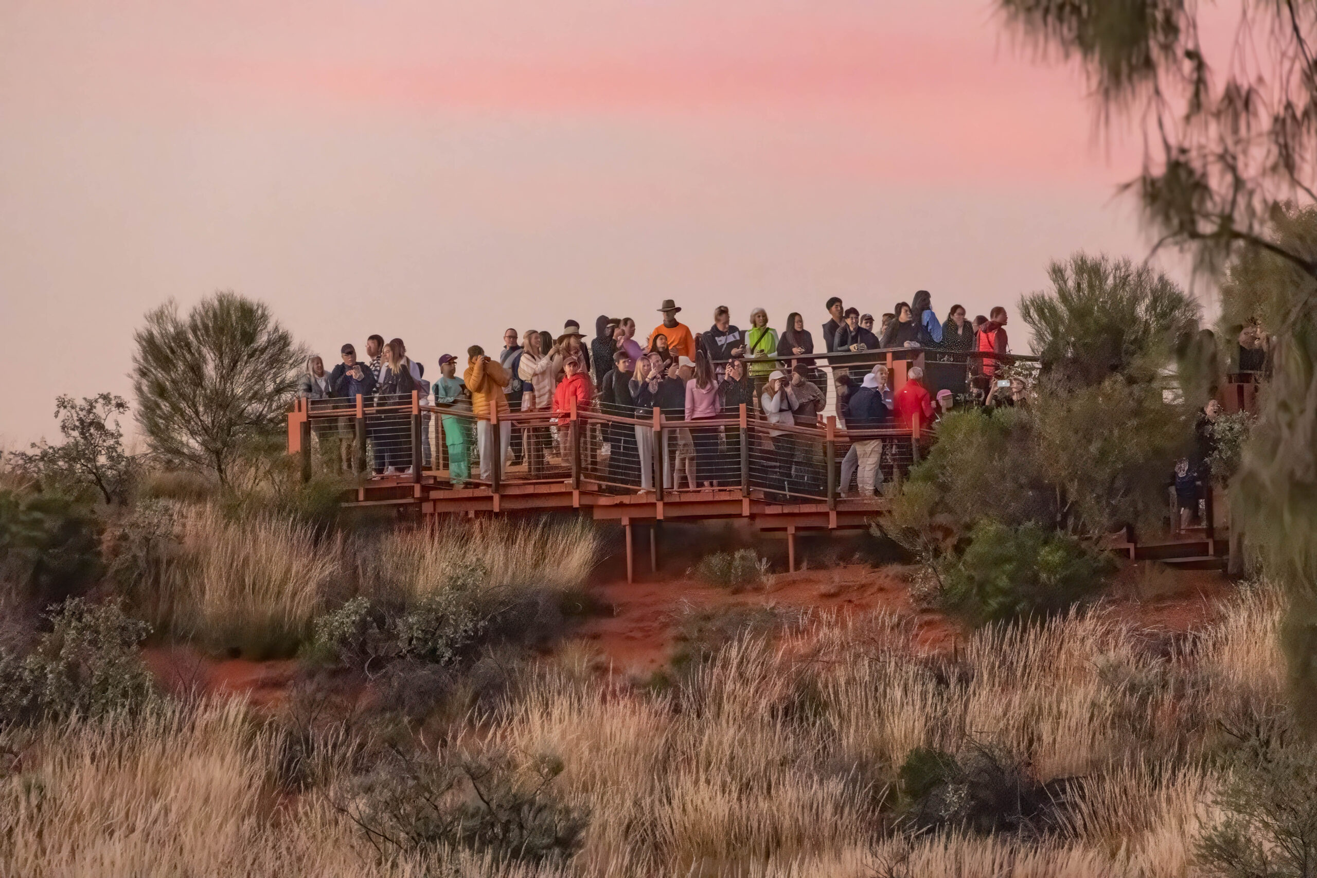We did eventually wander over to the servo. While we were out (and revived by our Splices!) we walked out the boardwalk to Luritja Lookout, where we were able to take our first photos of this beautiful place. Maybe we’ll have a night off tonight from watching the sun set but, before we move on, we’ll probably catch yet another sunset with a different backdrop. Although technically we are not watching sunsets, we are watching the play of light on the geological features that the setting sun is casting its dying rays onto.