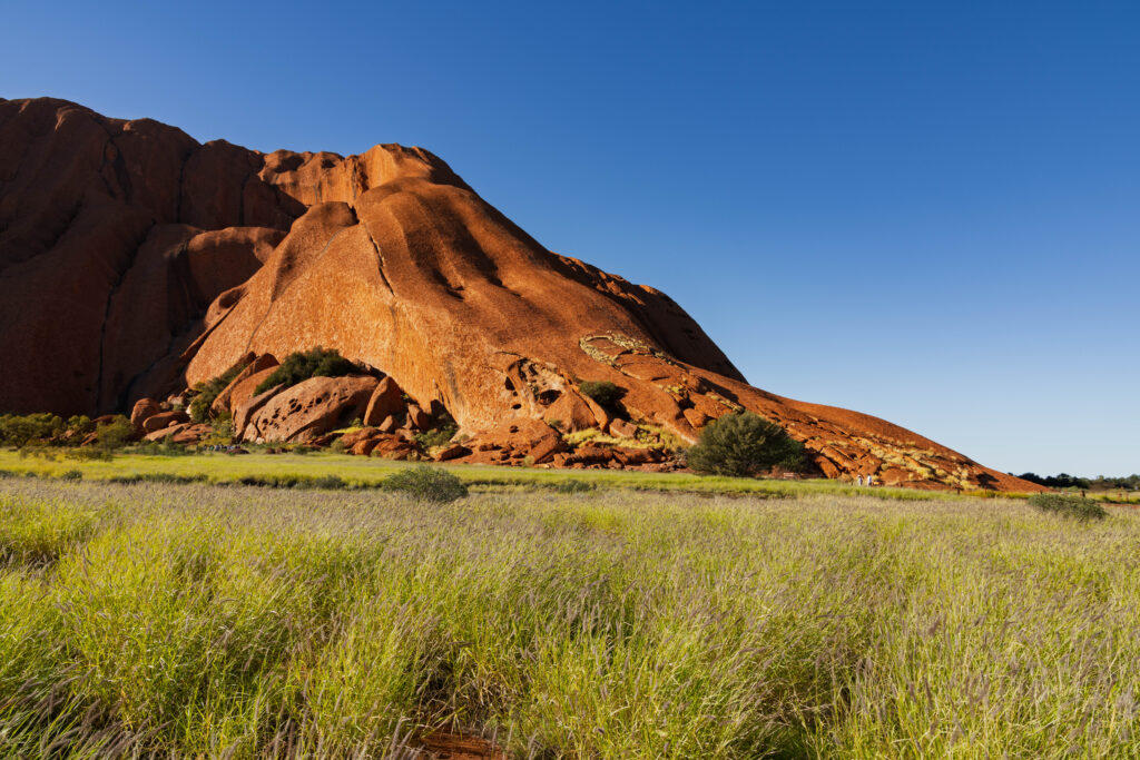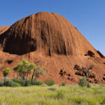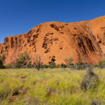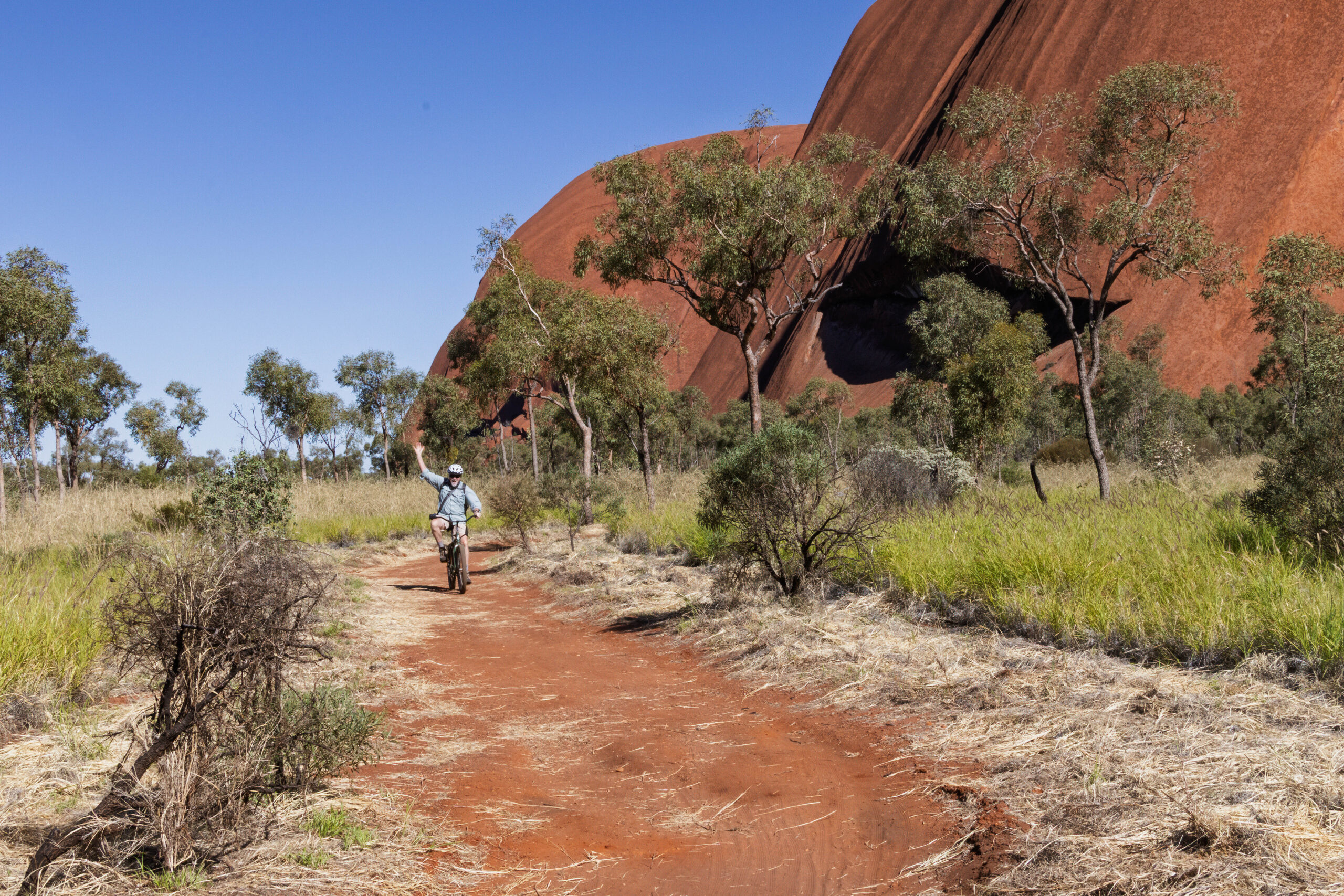 The Outback Cycles staff issued us with bikes and helmets and sent us on our way (strictly anti clockwise for cyclists) and instructions to be back by noon to catch the shuttle back to Yulara. We enjoyed a lovely leisurely ride on the ridiculously lush path around the base of The Rock. The majestic arid scenery being not quite so arid just at the moment! The sun was shining and the sky was blue and The Rock was red. Birds and butterflies were the positives. Blowflies were the negative. It was a toss up whether to wear the fly nets or not? Wearing the net fixes the fly problem but at the cost of a clear view of the bike path and the scenery!! I opted to go without the fly net and paid the price by snorting a fly up my nose. I managed to catch it in my mouth and spit it out so, avoided swallowing it but, Yuck!