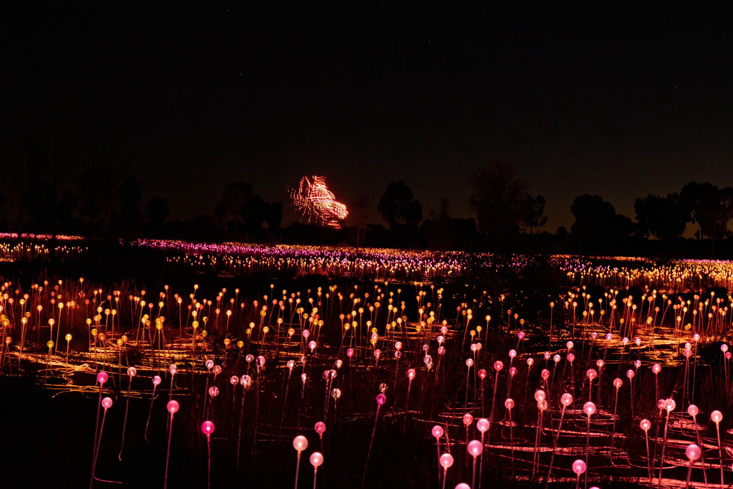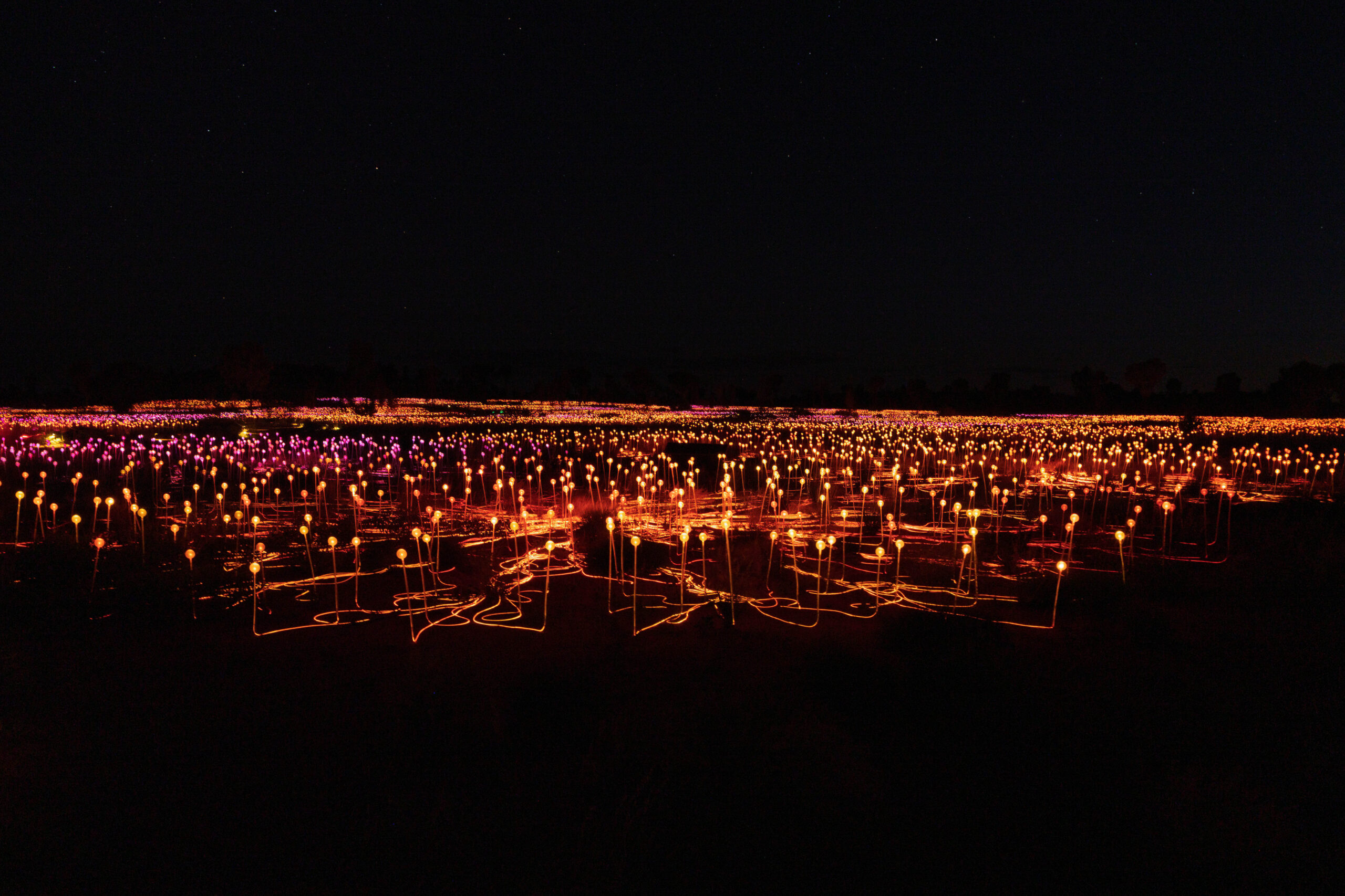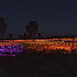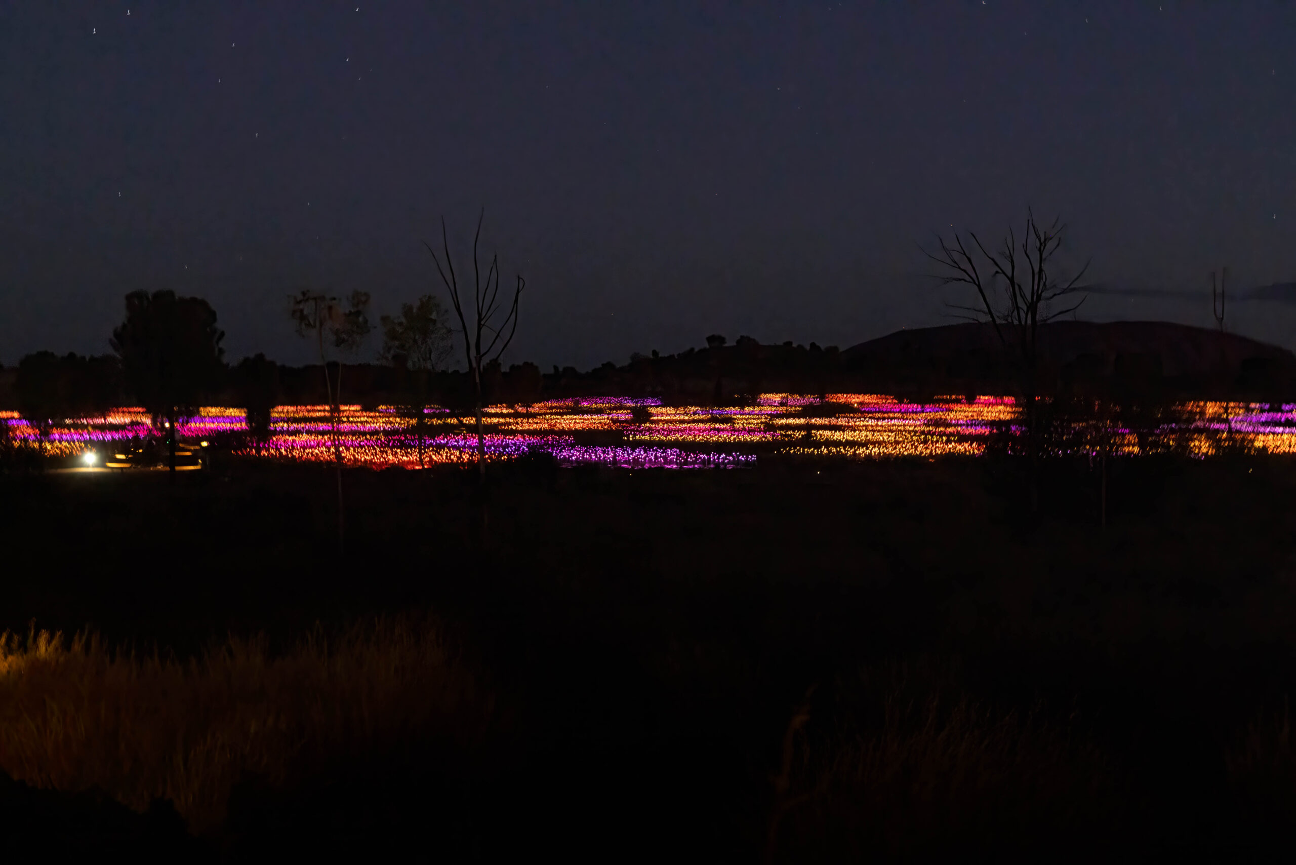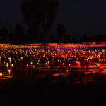Back in town we decided it was Splice o’clock and then time to check out the pool. We spent an hour or so by the pool while we had some washing going in the laundry. The pool was … refreshing. With our washing hung out to dry behind our room, we showered and dressed to head out for another evening activity, this time the Field of Light. The Field of Light Uluru is a massive, award-winning light installation by artist Bruce Munro. Fully solar powered, the display features 50,000 spindles of light, arrayed over an area equal to seven football fields. The light spheres change colour through ochre, violet, blue and white in a design that reflects the blooming of the desert after rain. The Field of Light was installed in 2016 for a planned run of six months. Then it was extended for another six months, and another. This year it has celebrated its 10th anniversary. Our guide tonight told us that it is definitely (maybe?) going to conclude in 2029.
