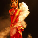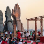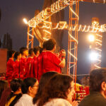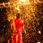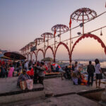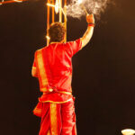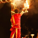 The ritual is performed by seven young priests in traditional attire on elevated platforms who perform choreographed movements involving incense, sandalwood tapers, heavy brass lamps loaded with burning candles, peacock feather fans, water, flowers and a conch shell horn. The ceremony symbolizes the eternal bond of the city with the Ganges River. Very intense.