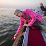 We stopped in the river, bobbing in the wake of other boats, as Dinesh lit our flower candles. These floral offerings (diyas) are a way of giving thanks to the river goddess and asking for blessings. We all lowered our candles, in their small leaf baskets, onto the surface of the river and watched them float away. The solemnity of this ritual juxtaposed with our boat driver becoming anxious about us putting our life jackets on because the water police were coming.