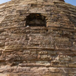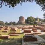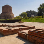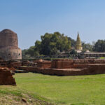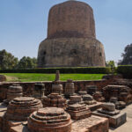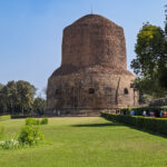 Back at the hotel it was well and truly time for a late (9.30am) breakfast. At 11.00am we rejoined Dinesh in the foyer, before squeezing back into the bus to have Suneet drive us to the city of Sarnath, just 10 kilometres from Varanasi. Sarnath is a highly revered Buddhist pilgrimage centre as it’s believed that after reaching enlightenment at Bodh Gaya, Lord Buddha preached his first sermon here. The great Dhamek Stupa, and several other structures, stand testimony to the importance the place enjoyed at that time. The Chaukhandi Stupa is where, during his first visit to Sarnath, Lord Buddha met his first five disciples. The area is a treasure trove of archaeological findings such as Dharmarajika Stupa and Mulagandha Kuti Vihar.