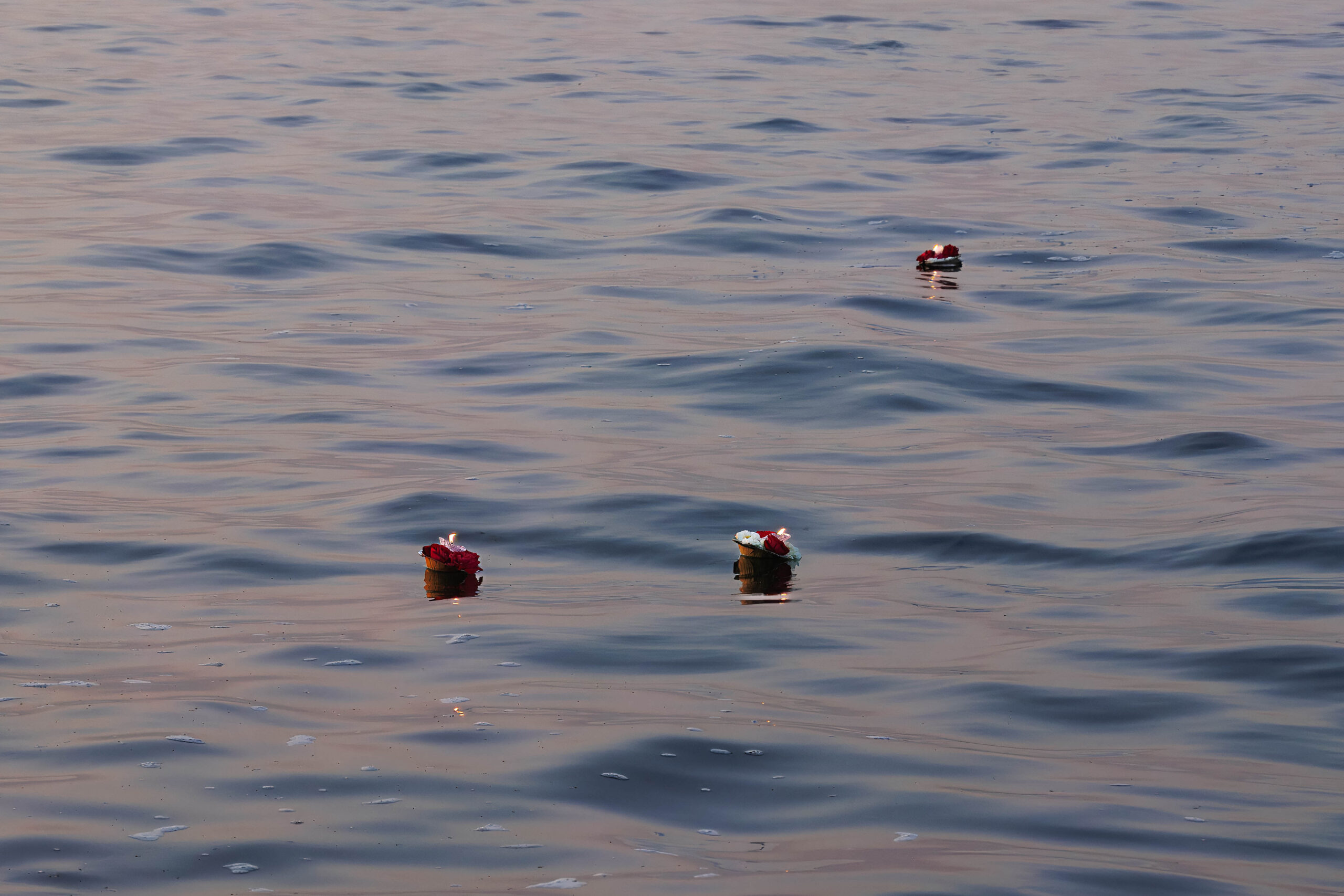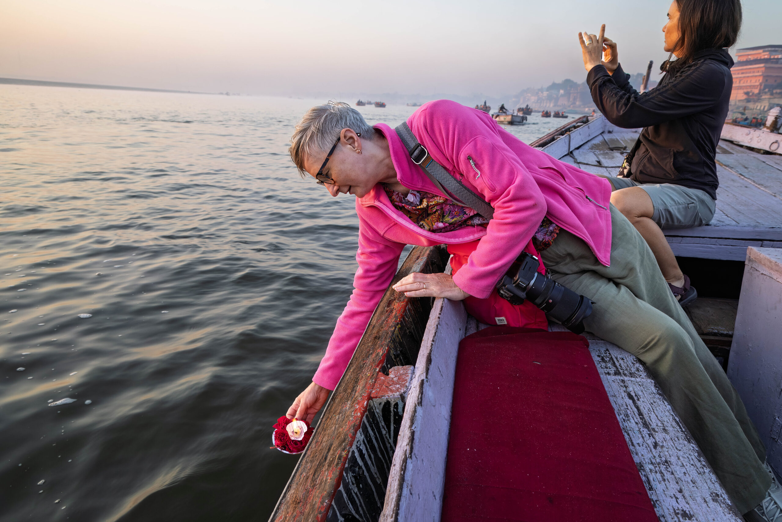 We stopped in the river, bobbing in the wake of other boats, as Dinesh lit our flower candles. These floral offerings (diyas) are a way of giving thanks to the river goddess and asking for blessings. We all lowered our candles, in their small leaf baskets, onto the surface of the river and watched them float away. The solemnity of this ritual juxtaposed with our boat driver becoming anxious about us putting our life jackets on because the water police were coming.