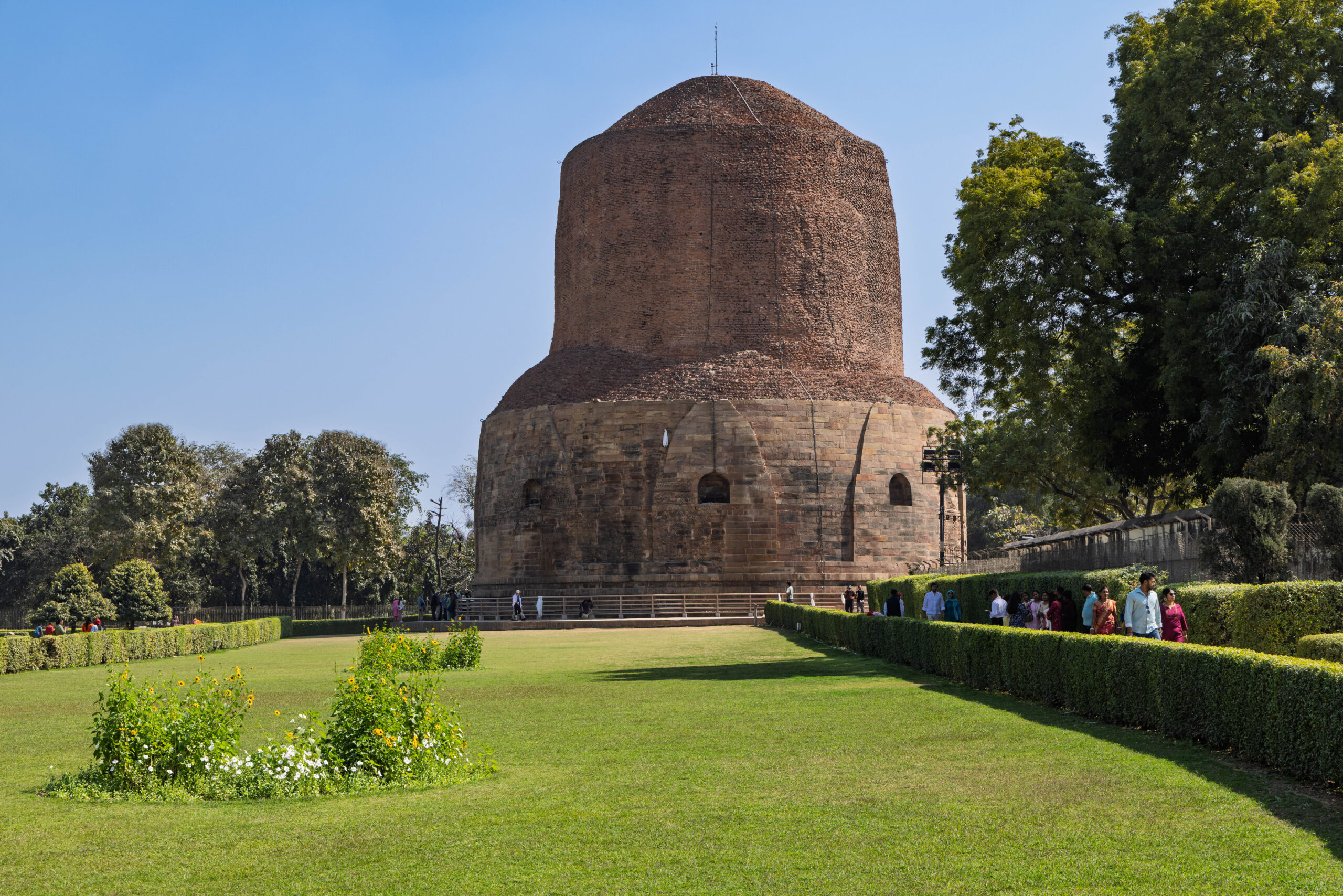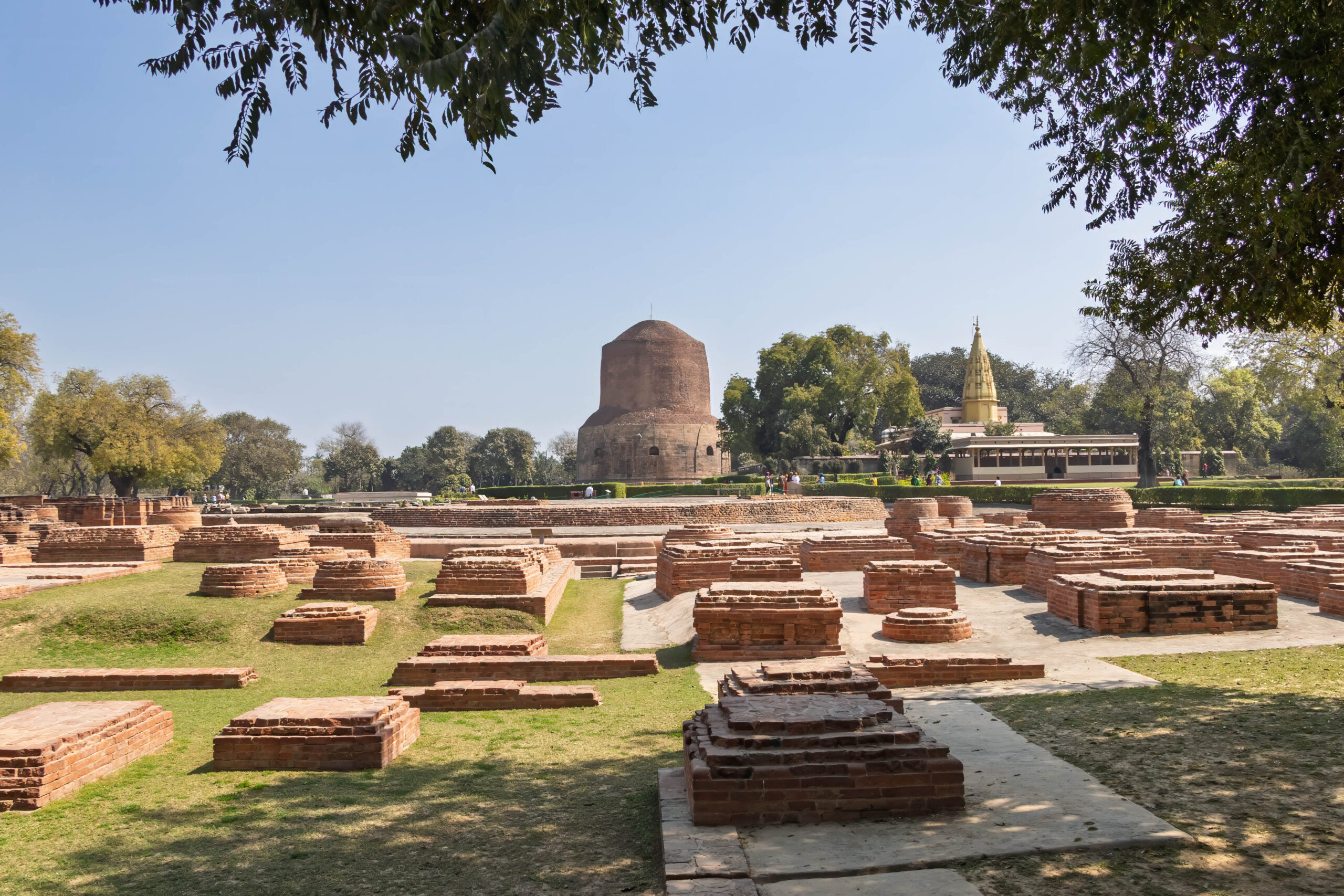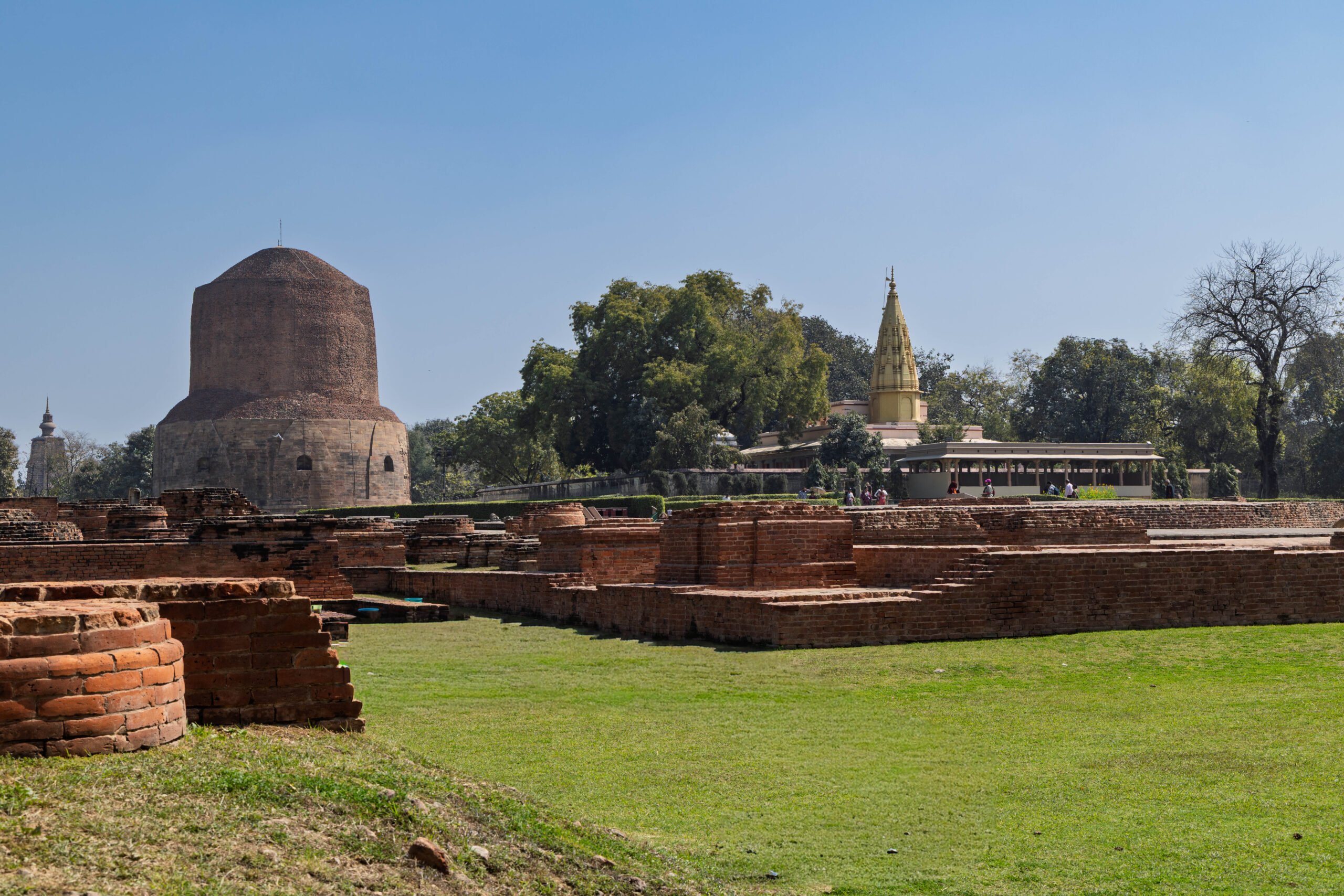 Back at the hotel it was well and truly time for a late (9.30am) breakfast. At 11.00am we rejoined Dinesh in the foyer, before squeezing back into the bus to have Suneet drive us to the city of Sarnath, just 10 kilometres from Varanasi. Sarnath is a highly revered Buddhist pilgrimage centre as it’s believed that after reaching enlightenment at Bodh Gaya, Lord Buddha preached his first sermon here. The great Dhamek Stupa, and several other structures, stand testimony to the importance the place enjoyed at that time. The Chaukhandi Stupa is where, during his first visit to Sarnath, Lord Buddha met his first five disciples. The area is a treasure trove of archaeological findings such as Dharmarajika Stupa and Mulagandha Kuti Vihar.