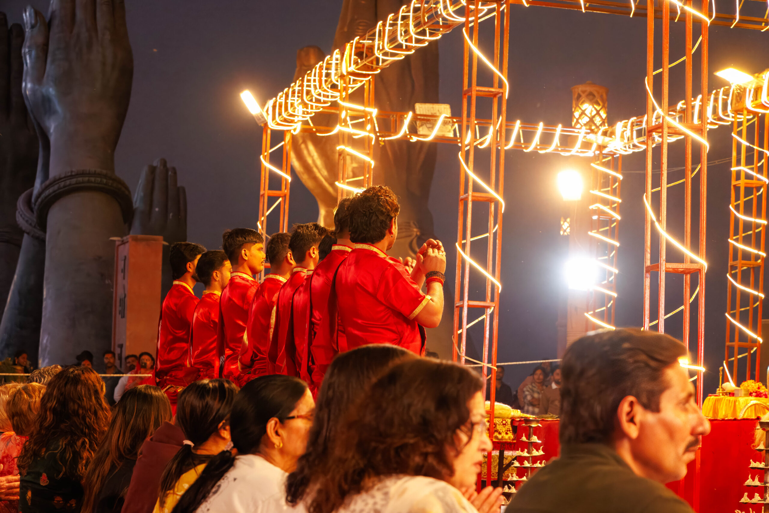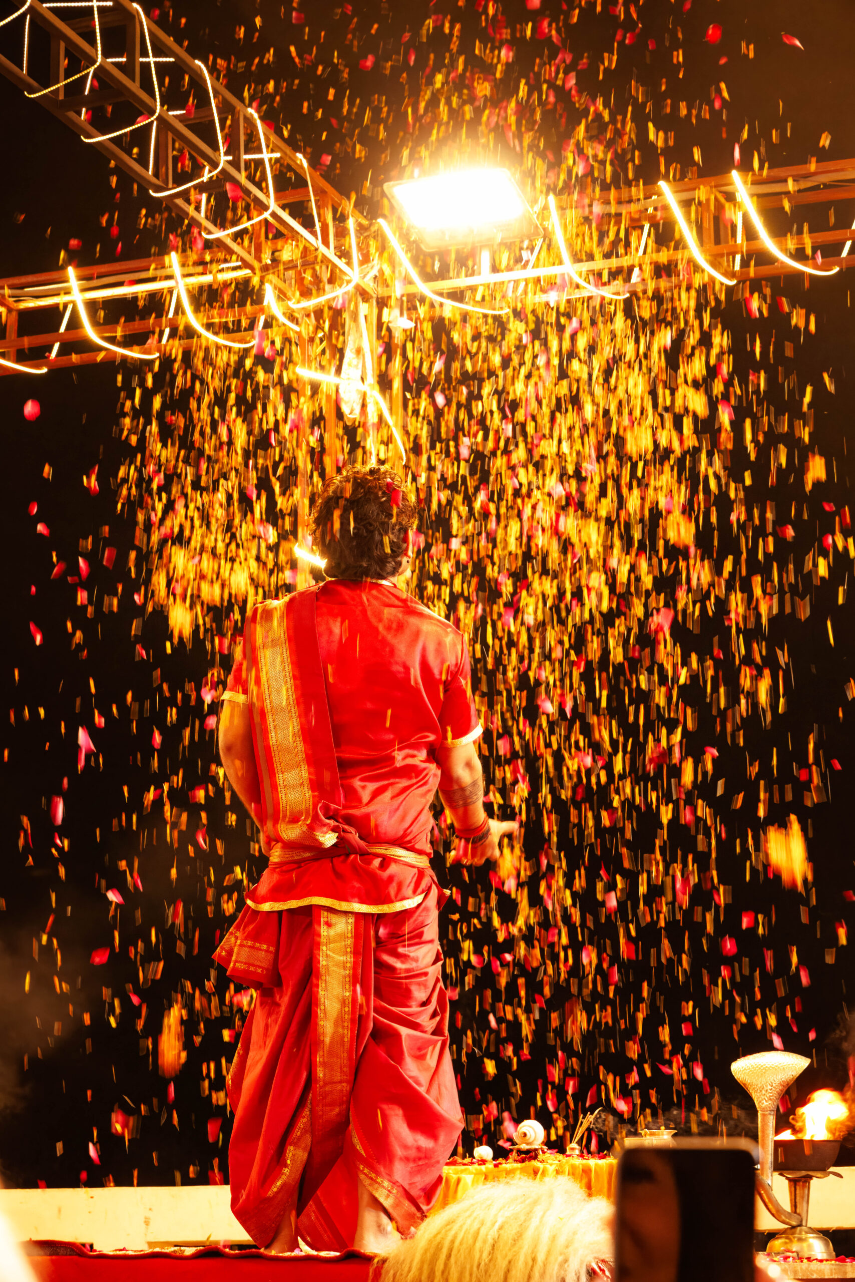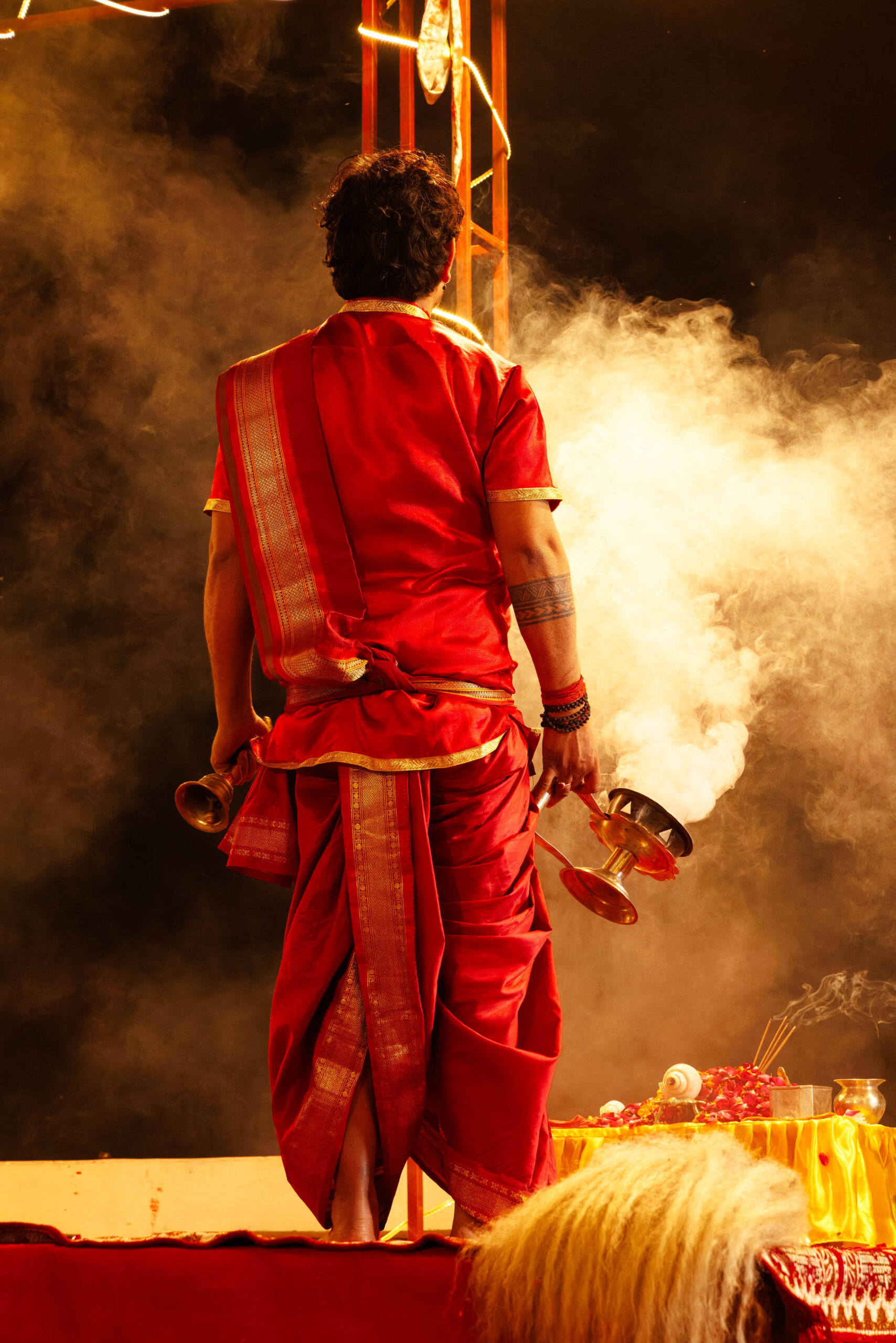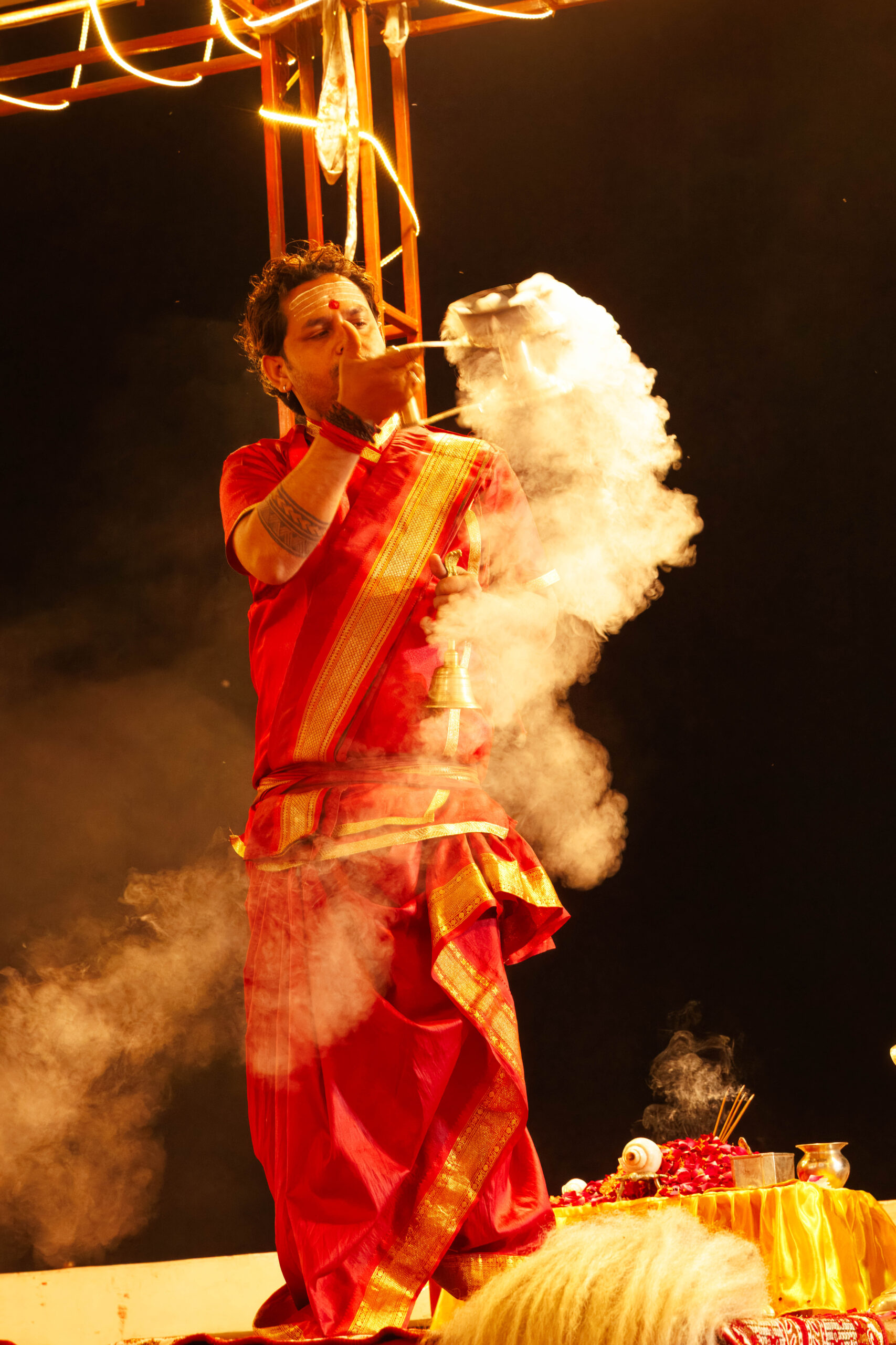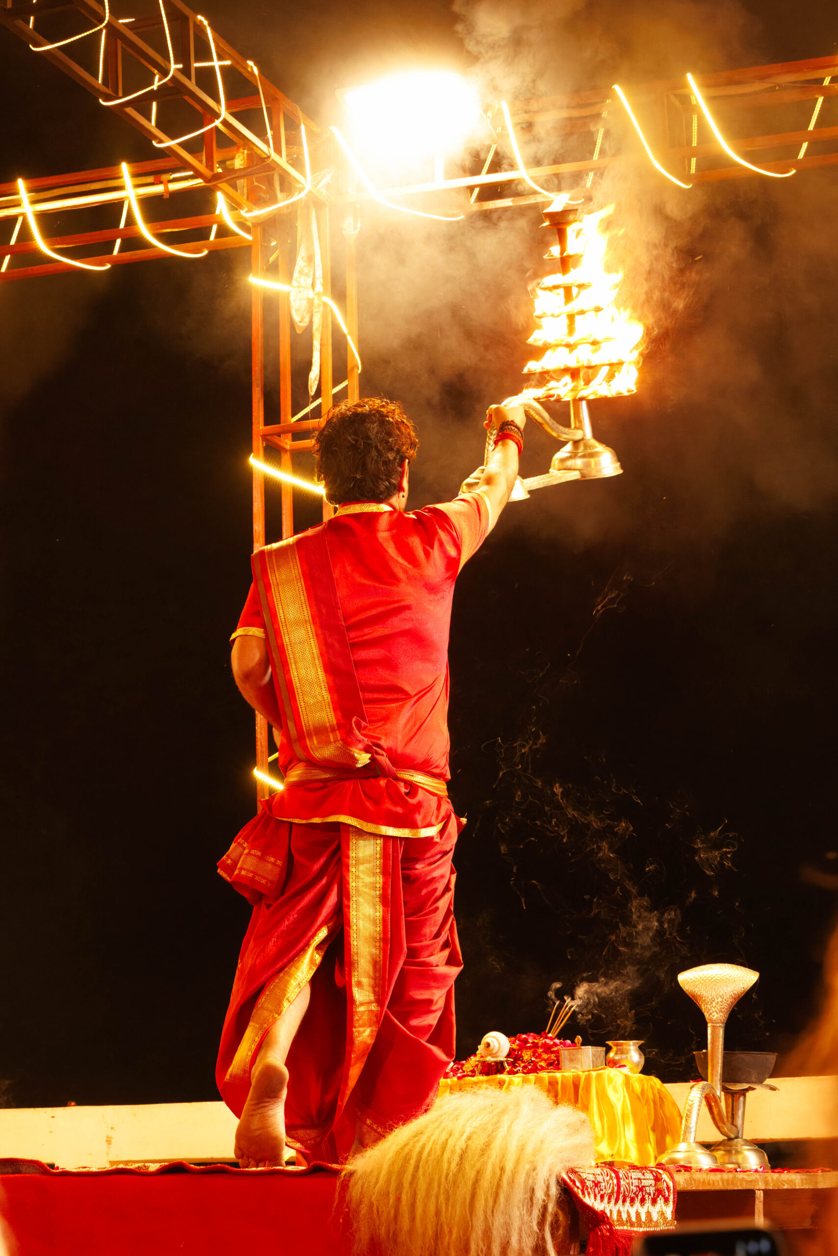 The ritual is performed by seven young priests in traditional attire on elevated platforms who perform choreographed movements involving incense, sandalwood tapers, heavy brass lamps loaded with burning candles, peacock feather fans, water, flowers and a conch shell horn. The ceremony symbolizes the eternal bond of the city with the Ganges River. Very intense.