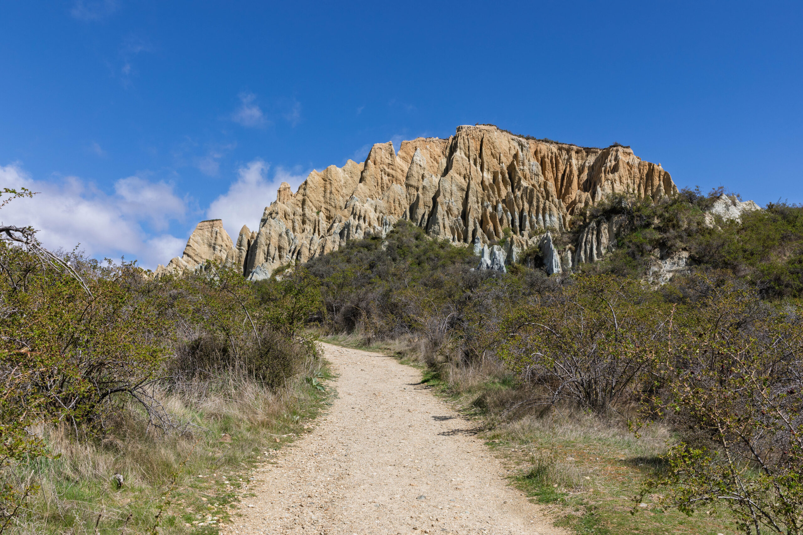Continuing on State Highway 8, we turned westerly to travel alongside the Ahuri River and through Omarama. On the northern outskirts of Omarama we spotted a sign for the Clay Cliffs Scenic Area. OK, the sun is shining and we have time for sightseeing, we might as well check the cliffs. Something different from lakes and snow covered mountains!
