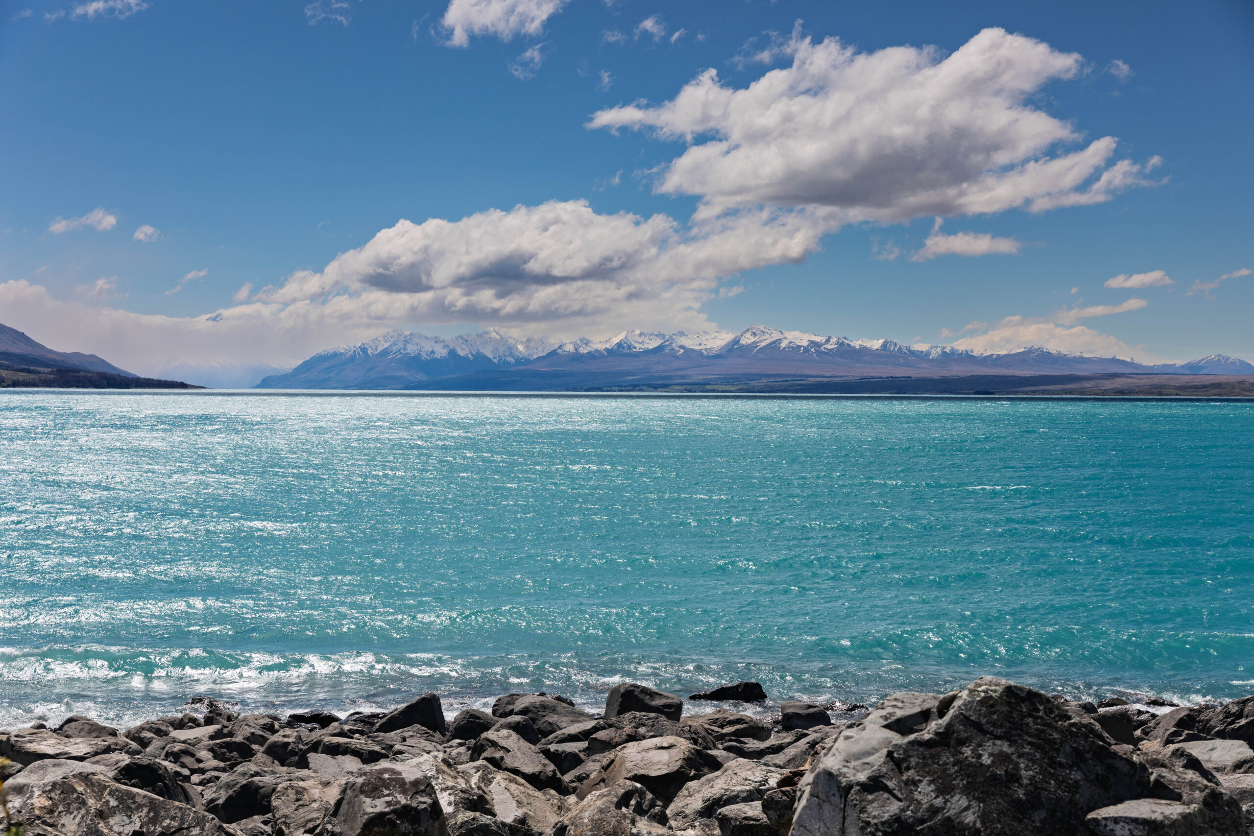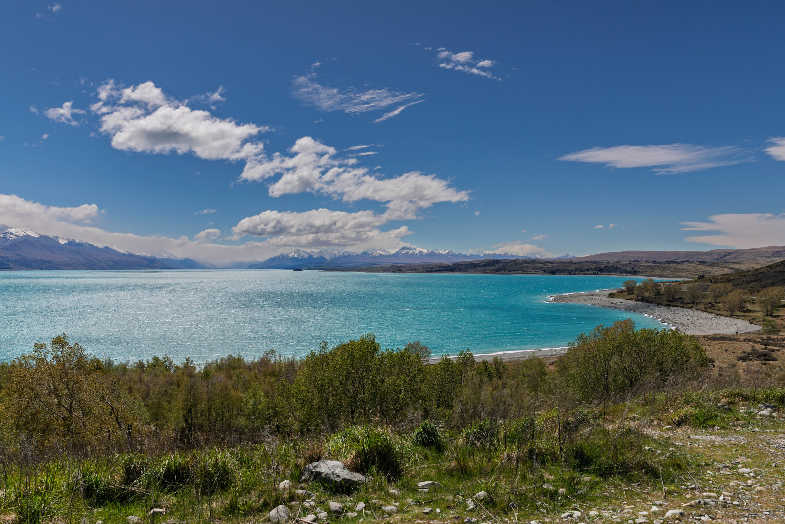 After lunch we continued to Pūkaki, at the southern end of Lake Pūkaki, where we turned left towards Lake Tekapo. We stopped to take a number of photos towards Aoraki/Mount Cook, from various scenic lookouts around the end of the lake. We think we were seeing the Ben Ohau Range on the left and the Burnett Mountains on the right of the lake, with Mt Cook nestled between and behind them obscured by cloud??