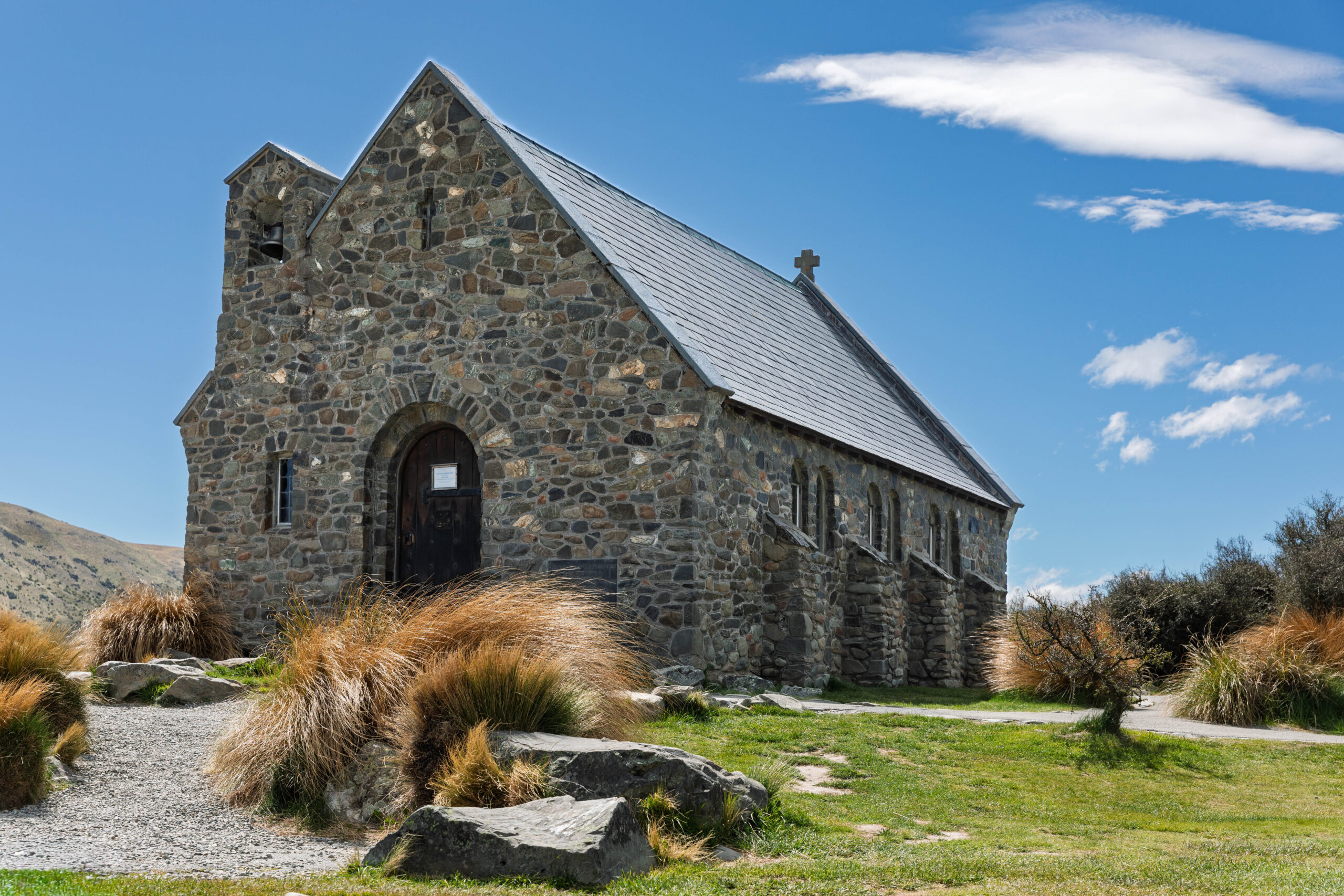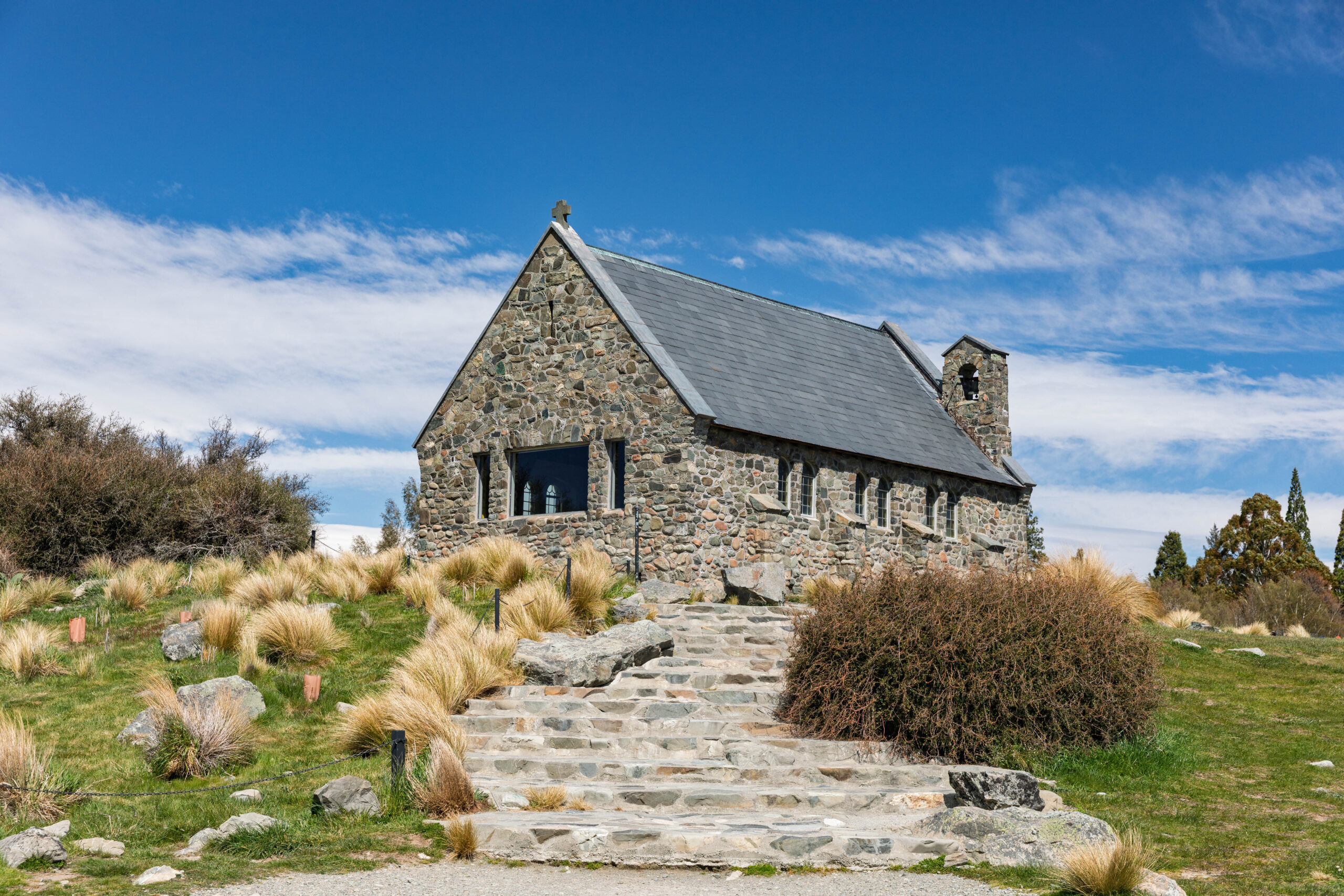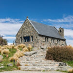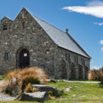 We struck off around Mount Mary and Mount McDonald, crossed the Tekapo Canal and made our way into Tekapo. Bernie had chosen the Church of the Good Shepherd as our destination, so we drove through town and parked up at the church. Opened in 1935 the Church of the Good Shepherd was designed to give the impression of quiet strength and simplicity to embody in the building the essential qualities of the early settlers who endured the tough Mackenzie Country environment. The modest stone church was built firstly to the glory of God and secondly, as a memorial to the pioneers of the district.