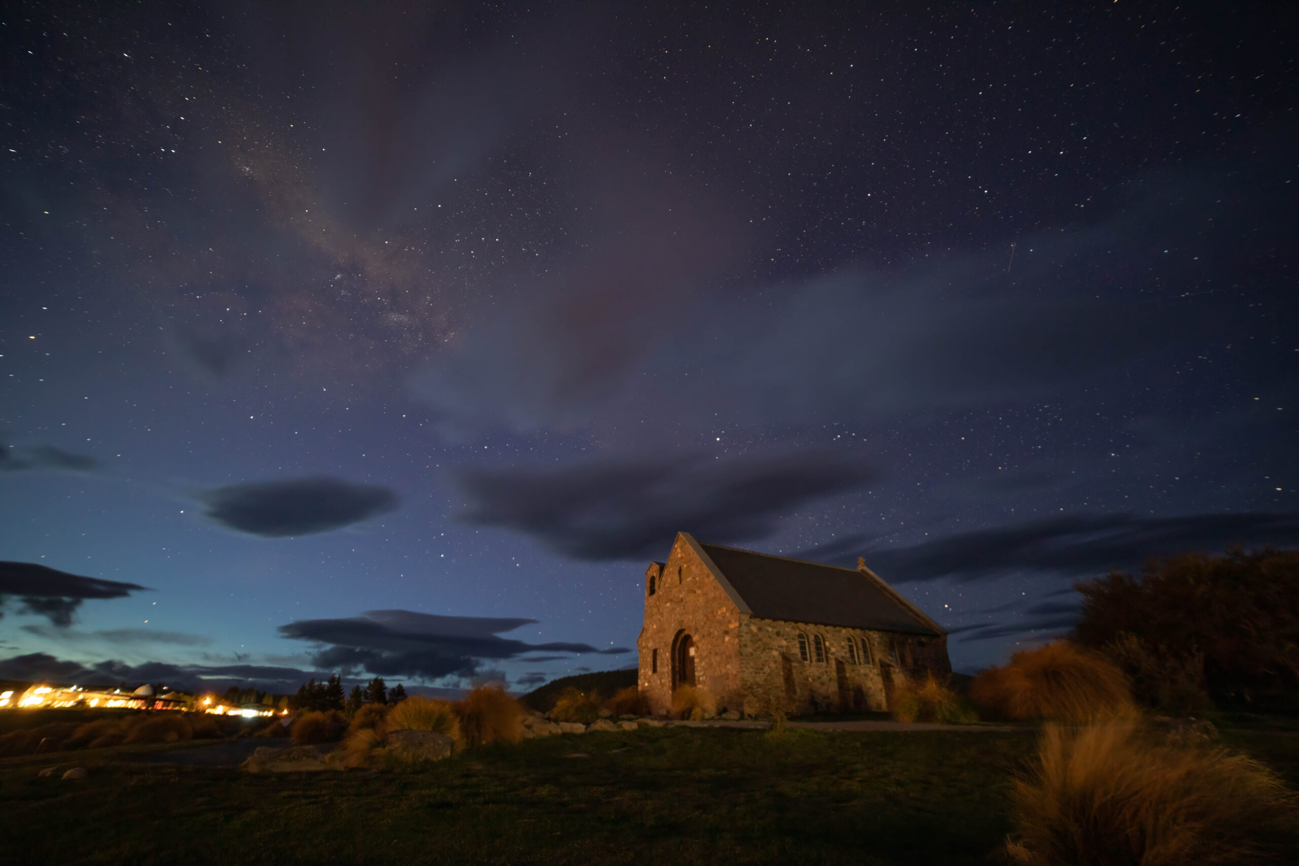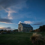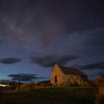 Bloody New Zealand weather. We drove down to the Church of the Good Shepherd about 9.00pm and the clouds were a problem. The section of the sky that was the most cloudy? The bit where the Milky Way should have been. Bernie took some photos anyway so that he could practice stacking the images. And, we were not the only people at the church in the dark. There were a few others with tripods and DSLRs but many others with only their mobile phones and others not attempting photos at all. We’re not sure if perhaps people we expecting the church to be floodlit to make a night time visit worthwhile??
